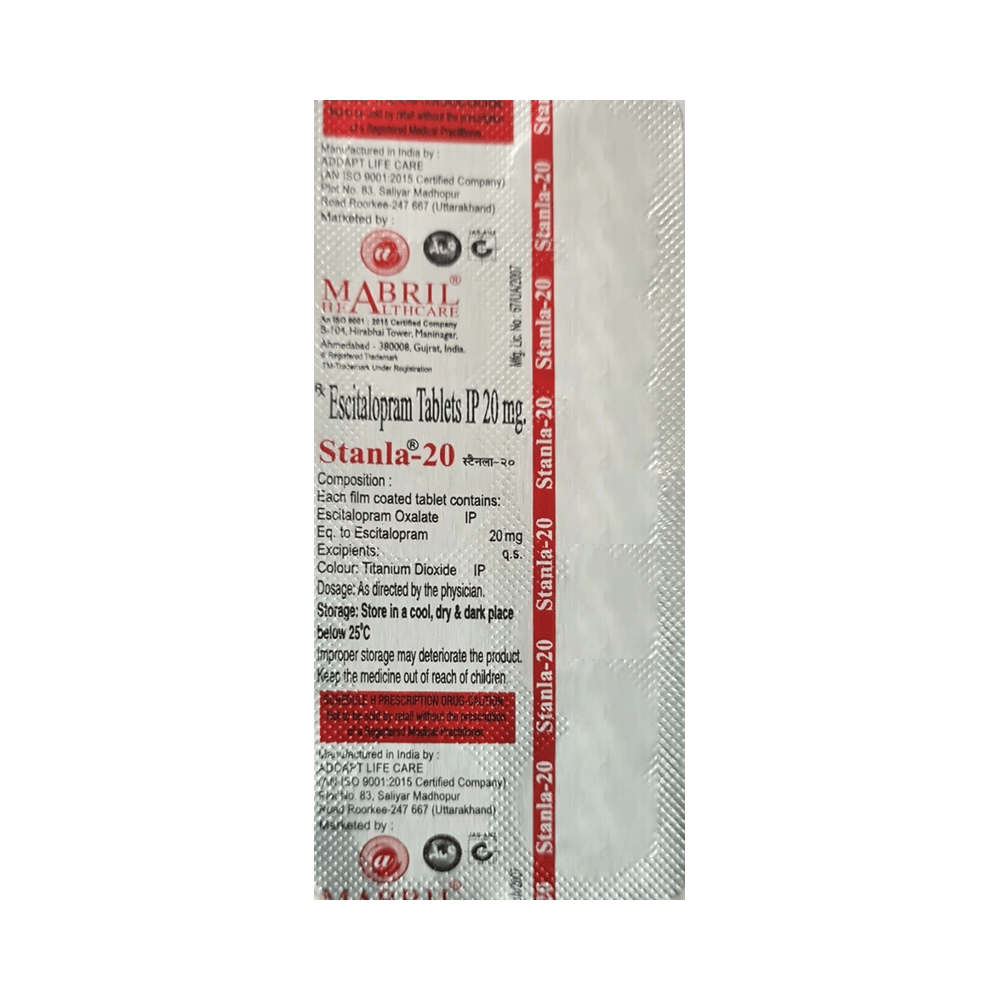 Stanla 20 Tablet is widely prescribed to treat depression and other mental health conditions like anxiety, panic disorder, and obsessive-compulsive disorder. It is a type of antidepressant known as a selective serotonin reuptake inhibitor (SSRI). Stanla 20 Tablet helps recover from depression by improving mood and relieving anxiety and tension. It can be taken with or without food. The dose and how often you need it will be decided by your doctor based on the amount needed to control your symptoms. Your doctor may start you on a lower dose and increase it gradually. Do not change the dose or stop taking it without talking to your doctor, even if you feel well. Doing so may make your condition worse or you may suffer from unpleasant withdrawal symptoms such as anxiety, restlessness, palpitations, dizziness, sleep disturbances.To get the most benefit, take this medicine regularly at the same time each day. Your doctor may advise you to take it in the morning if you have trouble sleeping. It may take a few weeks before you start feeling better. Let your doctor know if you do not see any improvement even after 4 weeks.Some common side effects of this medicine include nausea, fatigue, increased sweating, insomnia (difficulty in sleeping), decreased sexual drive, delayed ejaculation, and women may experience difficulties achieving orgasm. Some people may experience sleepiness after taking this medicine. Let your doctor know straight away if you develop any sudden worsening of mood or any thoughts about harming yourself.Before taking Stanla 20 Tablet, you should tell your doctor if you have epilepsy (seizure disorder or fits), diabetes, liver or kidney disease, any heart problems, or are currently taking medicines for depression known as MAO inhibitors. These may affect your treatment. Please tell your doctor about all the medicines you are taking to make sure you are safe.