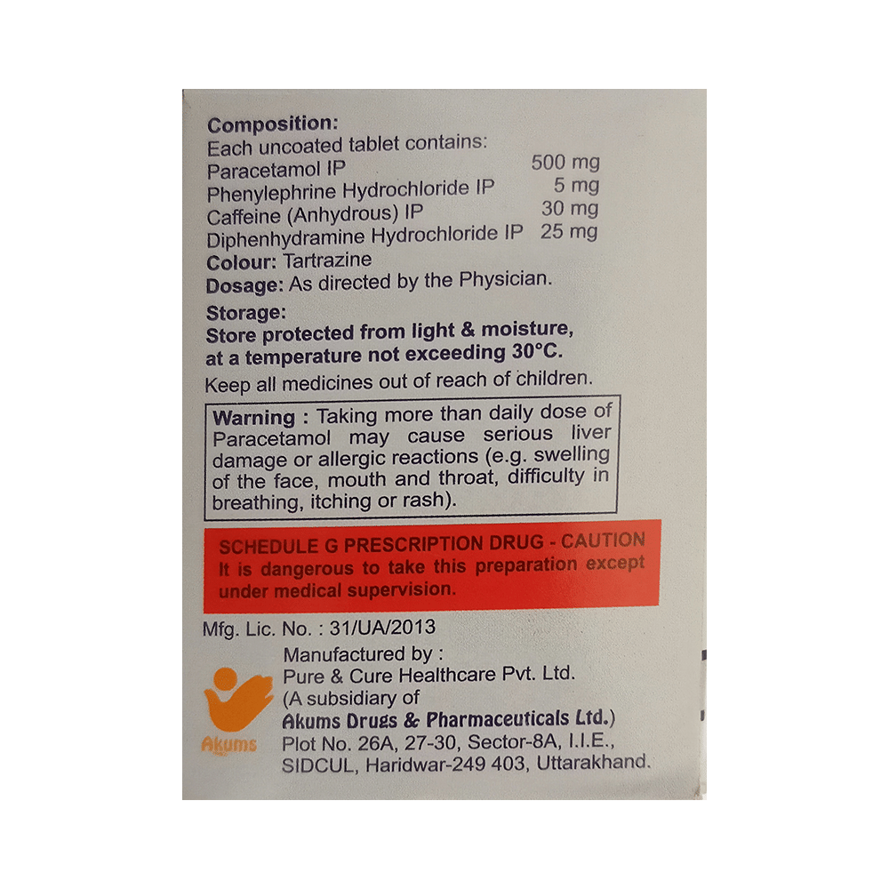 Salt Composition: Caffeine (30mg) + Diphenhydramine (25mg) + Paracetamol (500mg) + Phenylephrine (5mg)