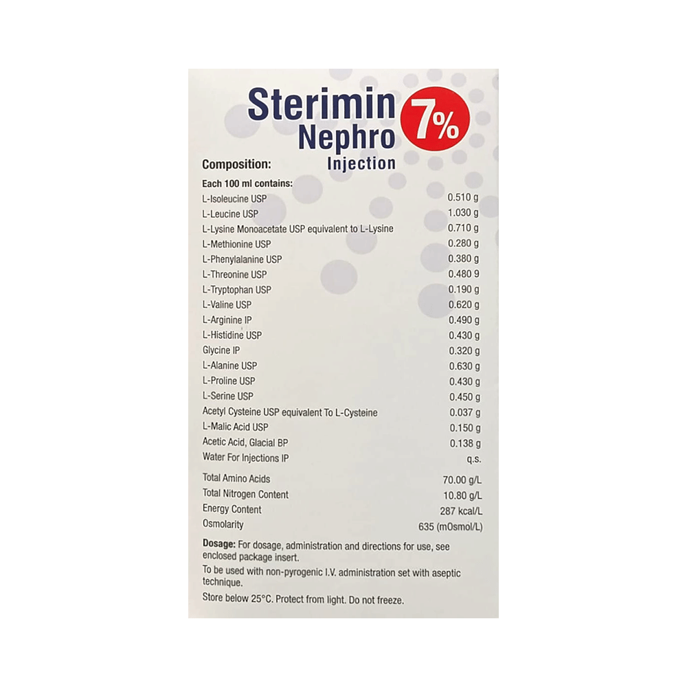 Sterimin Nephro 7% Injection are organic compounds that are chained together to form proteins. It is used to treat nutritional deficiencies. It promotes nitrogen-balancing in the body, also replenishes the protein reserve of the body in extensive burns or protein-calorie malnutrition. Sterimin Nephro 7% Injection is given under the supervision of a healthcare professional. Take it in a dose and duration as advised by the doctor. The full course of treatment should be completed as per prescription.This medicine may cause injection site inflammation (redness, swelling, and pain), acute folic acid deficiency, fever, and increased sweating as its side effects. It is better to consult with your doctor if any of the side effects bother you.This medicine may also cause metabolic and liver disorders, that is why it is important to undergo regular clinical evaluations and laboratory tests (blood and urine) to know the effects and side effects of this medicine on your organs. Before initiating this treatment, you must consult your doctor if you have any health conditions or your ongoing medications. Pregnant and breastfeeding women should only take this medicine if advised by the doctor.