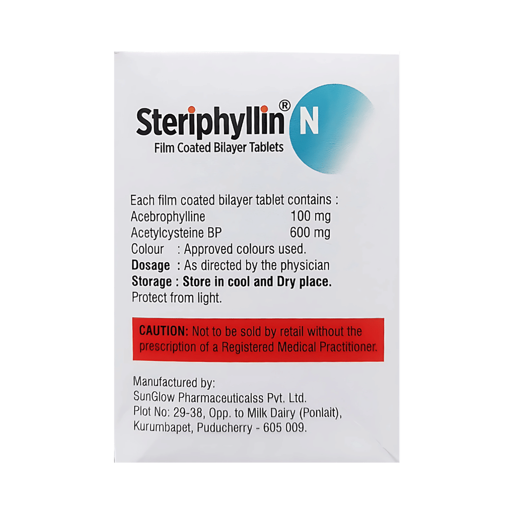 Steriphyllin N Tablet is a combination of two medicines: Acebrophylline and Acetylcysteine. Acebrophylline is a mucolytic and bronchodilator. It works by relaxing the muscles of the airways and also thins and loosens mucus, making it easier to breathe. Acetylcysteine is a mucolytic medication. It thins and loosens mucus (phlegm), making it easier to cough out.