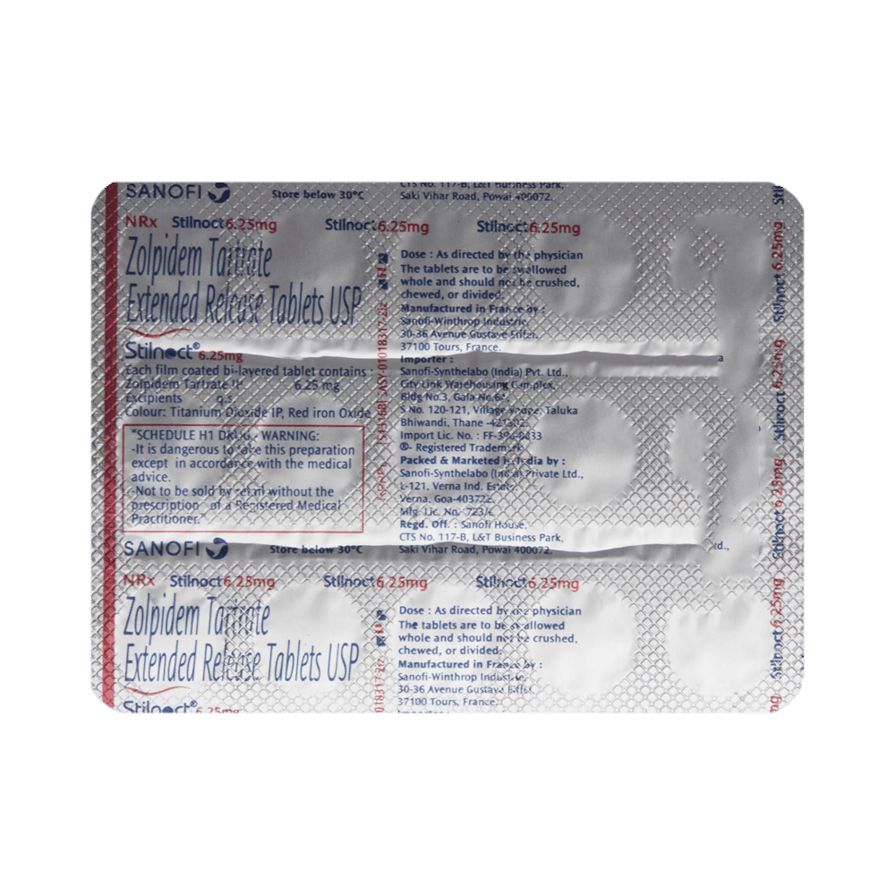 Stilnoct 6.25mg Tablet is used for short-term treatment of insomnia. It reduces sleep onset time and frequent awakening at night. This medicine improves sleep maintenance and therefore ensures sound sleep. Stilnoct 6.25mg Tablet should be taken on an empty stomach, preferably just before going to bed. However, it is advised to take it at the same time each day as this helps to maintain a consistent level of medicine in the body. Take this medicine in the dose and duration as advised by your doctor as it is habit-forming. Do not stop taking it suddenly without talking to your doctor as it may worsen your symptoms.Some common side effects of this medicine include memory loss, hallucinations, agitation, headache, vertigo, diarrhea, nausea, vomiting, and back pain. It may also cause fatigue, stomach pain, double vision, and depression. However, these are temporary and resolve on their own after some time. Please consult your doctor if these bother you or do not away.Stilnoct 6.25mg Tablet also causes dizziness and sleepiness, so do not drive or do anything that requires mental focus until you know how this medicine affects you, and do not take alcohol with it as it may worsen the dizziness. Inform your doctor if you develop any unusual changes in mood or behavior, new or worsening depression, hallucinations, or suicidal thoughts while taking this medicine.Before taking Stilnoct 6.25mg Tablet, inform your doctor about all other medicines that you are taking, so that your doctor can advise if taking this medicine is right for you. Consult your doctor before taking this medicine if you are suffering from any liver or kidney problems. You should avoid smoking and alcohol while using this medicine. Pregnant and breastfeeding mothers should not use this medicine. However, if the need arises, please consult your doctor before using it.