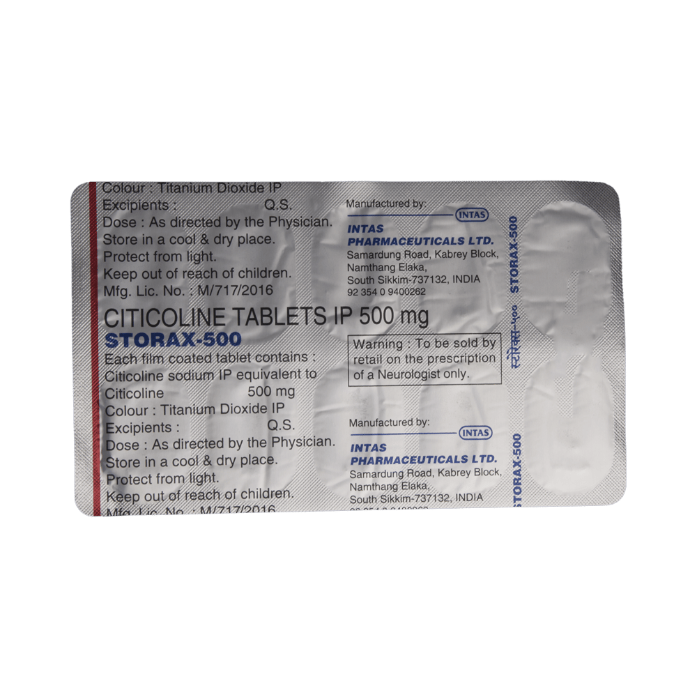 In Alzheimer's diseaseStorax 500 Tablet is used to support brain health in Alzheimer’s disease by improving memory and thinking ability. It may help slow the decline in cognitive function and enhance daily mental performance.In StrokeStorax 500 Tablet is used to support recovery after a stroke by helping protect brain cells and improving communication between them. It may aid in restoring memory, movement, and overall brain function during rehabilitation.In Dementia in Parkinson's diseaseFor memory problems in Parkinson’s disease, Storax 500 Tablet helps improve mental sharpness and recall. It may support better concentration and reduce forgetfulness in individuals affected by the condition.In Head injuryIn patients with head injury, Storax 500 Tablet helps reduce brain swelling and supports repair of damaged brain tissue. This may improve alertness, focus, and mental clarity during recovery.show moreshow less