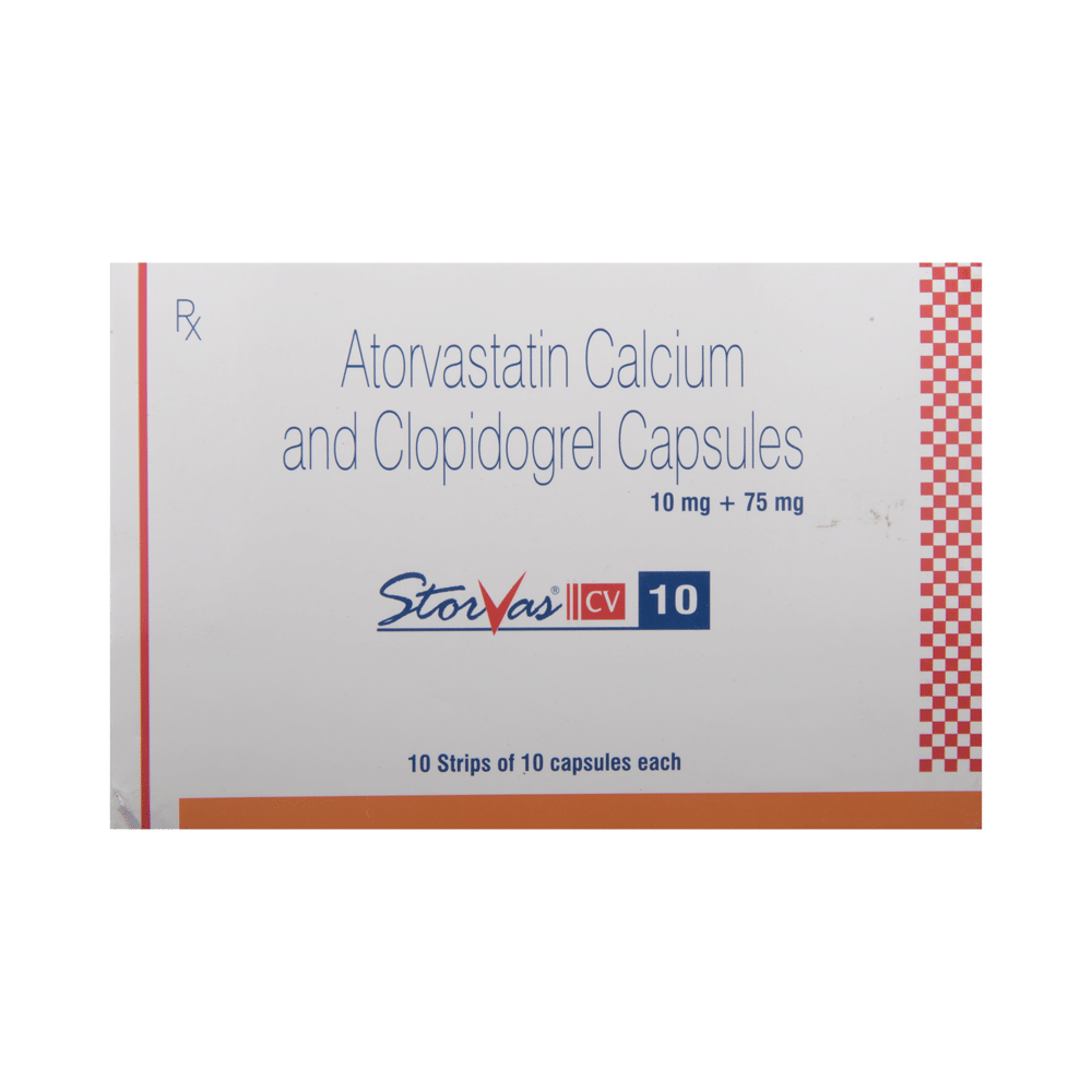 STORvas CV 10 Capsule is a combination of two medicines: Atorvastatin and Clopidogrel, which prevents heart attack and stroke.