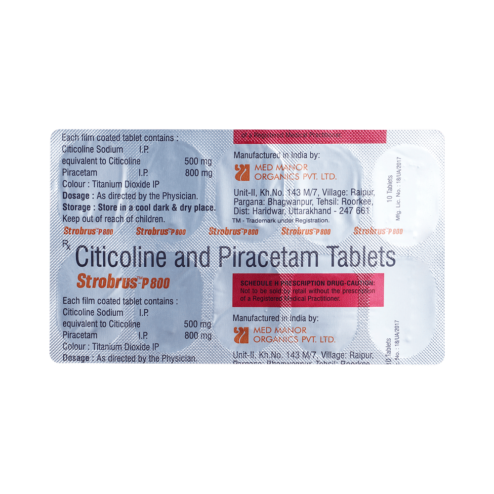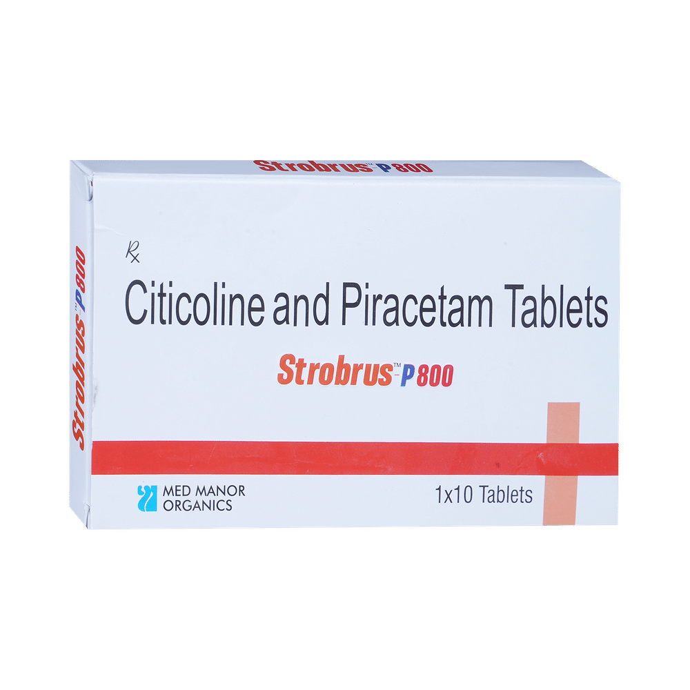 Strobrus P 500mg/800mg Tablet is a medicine used in stroke rehabilitation and as a cognitive enhancer. It protects the nerve cells in the brain from damage and also helps to repair the damaged nerve cells. It may also be used in the treatment of brain trauma. Strobrus P 500mg/800mg Tablet may be taken with or without food, preferably at the same time each day. Take it at the same time each day as this helps to maintain a consistent level of medicine in the body. Take this medicine in the dose and duration as advised by your doctor and if you have missed a dose, take it as soon as you remember it. Do not skip any doses and finish the full course of treatment even if you feel better. It is important that this medication is not stopped suddenly without talking to your doctor as it may worsen your symptoms.Some common side effects of this medicine include hyperactivity, stomach pain, nervousness, and decreased blood pressure. However, these are temporary and usually resolve on their own. Please consult your doctor if these do not subside or bother you. Drink plenty of fluids to keep yourself hydrated while taking this medicine as this medicine may cause diarrhea. This medicine may cause weight gain and to control it, you should have a balanced diet and exercise regularly.