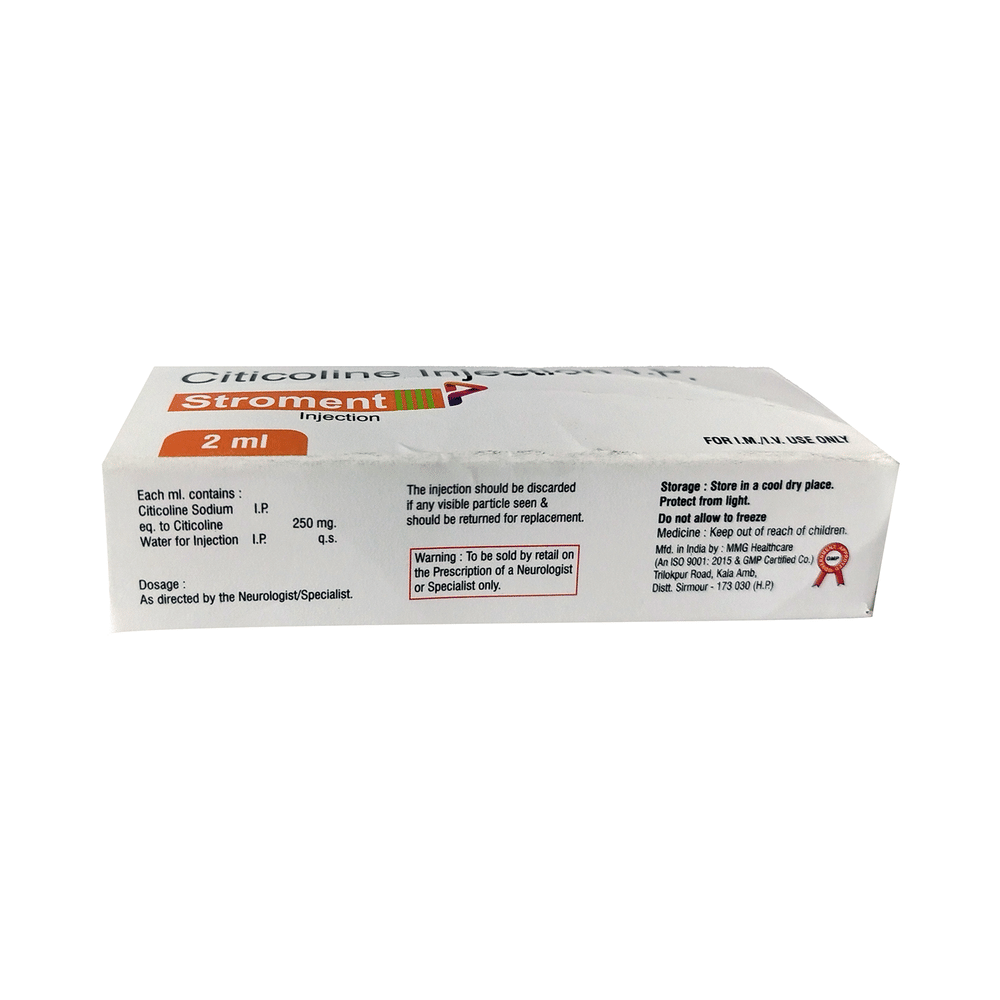 Stroment Injection is a medicine used in the treatment of stroke, head injury, Alzheimer's disease and memory loss (dementia) in Parkinson's disease. It protects the nerve cells in the brain from damage and also helps to repair the damaged nerve cells. Therefore, it improves learning and memory. Stroment Injection is administered as an injection under the supervision of a healthcare professional and should not be self administered. It is given in cases where oral administration is not possible. Take this medicine in the dose and duration as advised by your doctor and if you have missed a dose, take it as soon as you remember.Some common side effects that may be seen with this medicine include decreased blood pressure, stomach pain, diarrhea, irregular heart rate, rash, insomnia, and occurrence or intensification of numbness of paralyzed extremities. You may also notice some injection site reactions such as pain, redness or swelling. However, these are temporary and usually resolve on their own. Please consult your doctor if these do not subside or bother you.Before taking this medicine, inform your doctor if you ever had any problems with your kidneys or if you have or ever had any seizures (epilepsy or fits). Your dose depends on your age and the condition you are being treated for. Always let your doctor know about all the medicines that you are taking before you start with your treatment. Please inform your doctor if you are pregnant, planning to conceive or breastfeeding, before using this medicine.