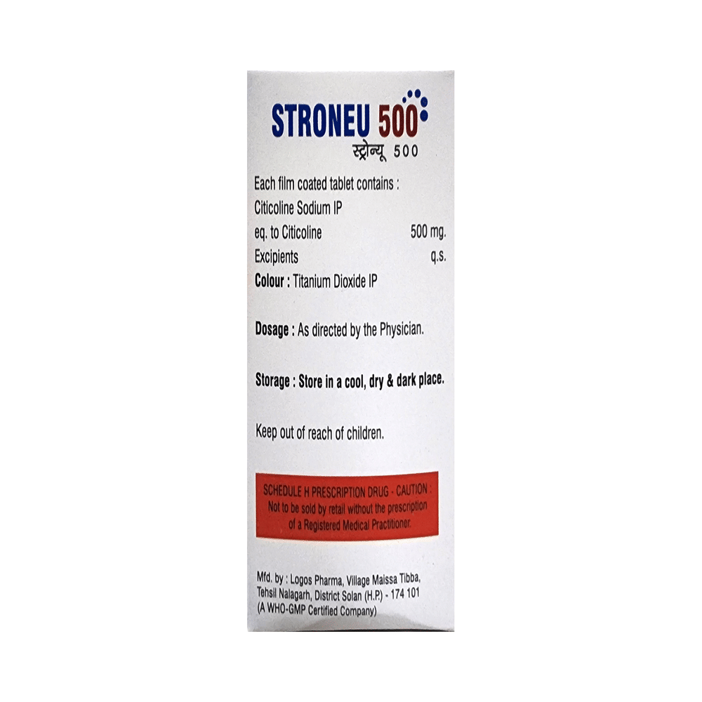 Stroneu 500 Tablet helps in the treatment of stroke, head injury, Alzheimer's disease, and memory loss (dementia) in Parkinson's disease. It protects the nerve cells in the brain from damage and also helps to repair the damaged nerve cells. Stroneu 500 Tablet may be taken with or without food. However, it is advised to take it at the same time each day as this helps to maintain a consistent level of medicine in the body. Your dose depends on your age and the condition you are being treated for. Take this medicine in the dose and duration as advised by your doctor. Do not stop taking it suddenly without talking to your doctor as it may worsen your symptoms.Some common side effects that may be seen with this medicine include decreased blood pressure, stomach pain, diarrhea, irregular heart rate, rash, insomnia, occurrence or intensification of numbness of paralyzed extremities. However, these are temporary and usually resolve on their own. Please consult your doctor if these do not subside or bother you.Before taking this medicine, inform your doctor if you ever had any problems with your kidneys or if you have or ever had any seizures (epilepsy or fits). Always let your doctor know about all the medicines that you are taking before you start with your treatment. Inform your doctor if you are pregnant, planning to conceive or breastfeeding, before using this medicine.