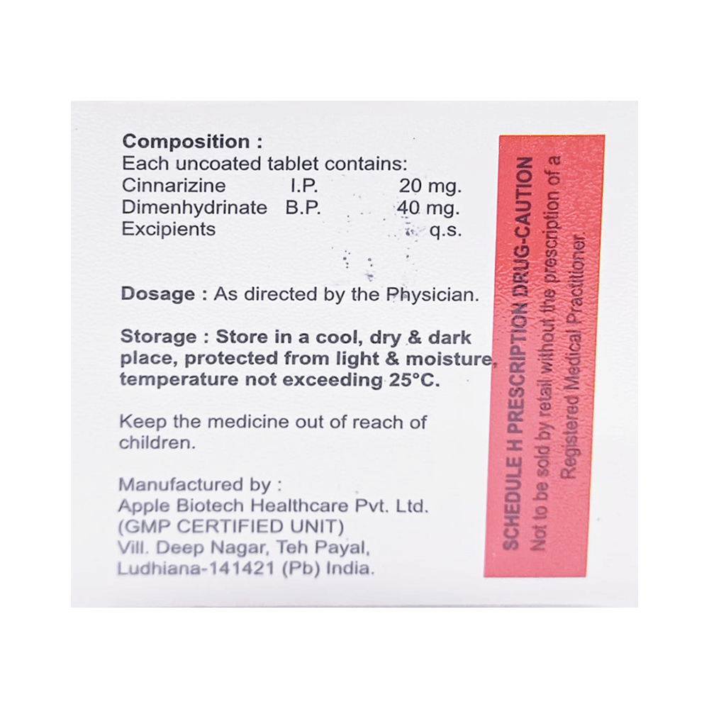 Salt Composition: Cinnarizine (20mg) + Dimenhydrinate (40mg)