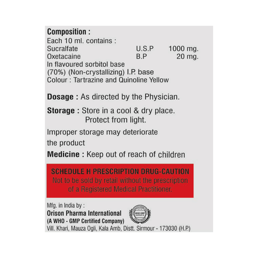 Salt Composition: Sucralfate (1000mg/10ml) + Oxetacaine (20mg/10ml)