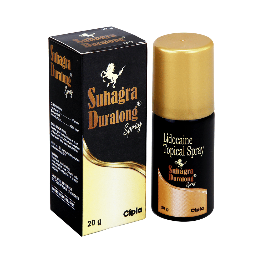 Suhagra Duralong Spray is a local anesthetic used to temporarily numb certain areas of the body. It is used as an anesthetic lubricant to insert instruments in the human body for medical procedures (e.g., catheters). It is also used for the treatment of symptoms of painful inflammation of the urethra and bladder. The most common side effects of this medicine include redness, rash, burning, and itching at the site of application. These are usually mild and short-lived. Consult your doctor if any of the side effects persist or worry you.Before using it, tell your doctor if you have liver disease or are taking medicines for heart rhythm problems. Although medicines used on the skin are not normally affected by other medicines you should let your doctor know if you are taking any other medicines to be safe. Ask your healthcare team for advice if you are pregnant or breastfeeding.