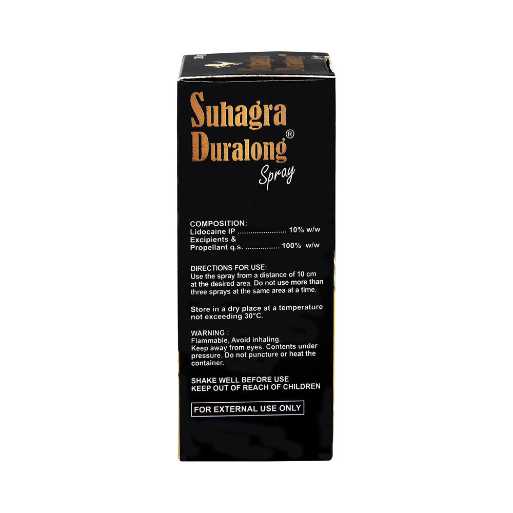 In Local anesthesia (Numb tissues in a specific area)Suhagra Duralong Spray provides quick and effective numbing, allowing procedures to be carried out without discomfort. It helps patients stay comfortable and pain-free without affecting consciousness or sensation in the rest of the body.