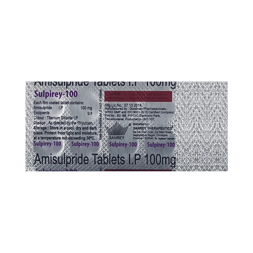 Sulpirey 100 Tablet is an atypical antipsychotic. It works by modulating the action of certain chemical messengers in the brain that affect thoughts.