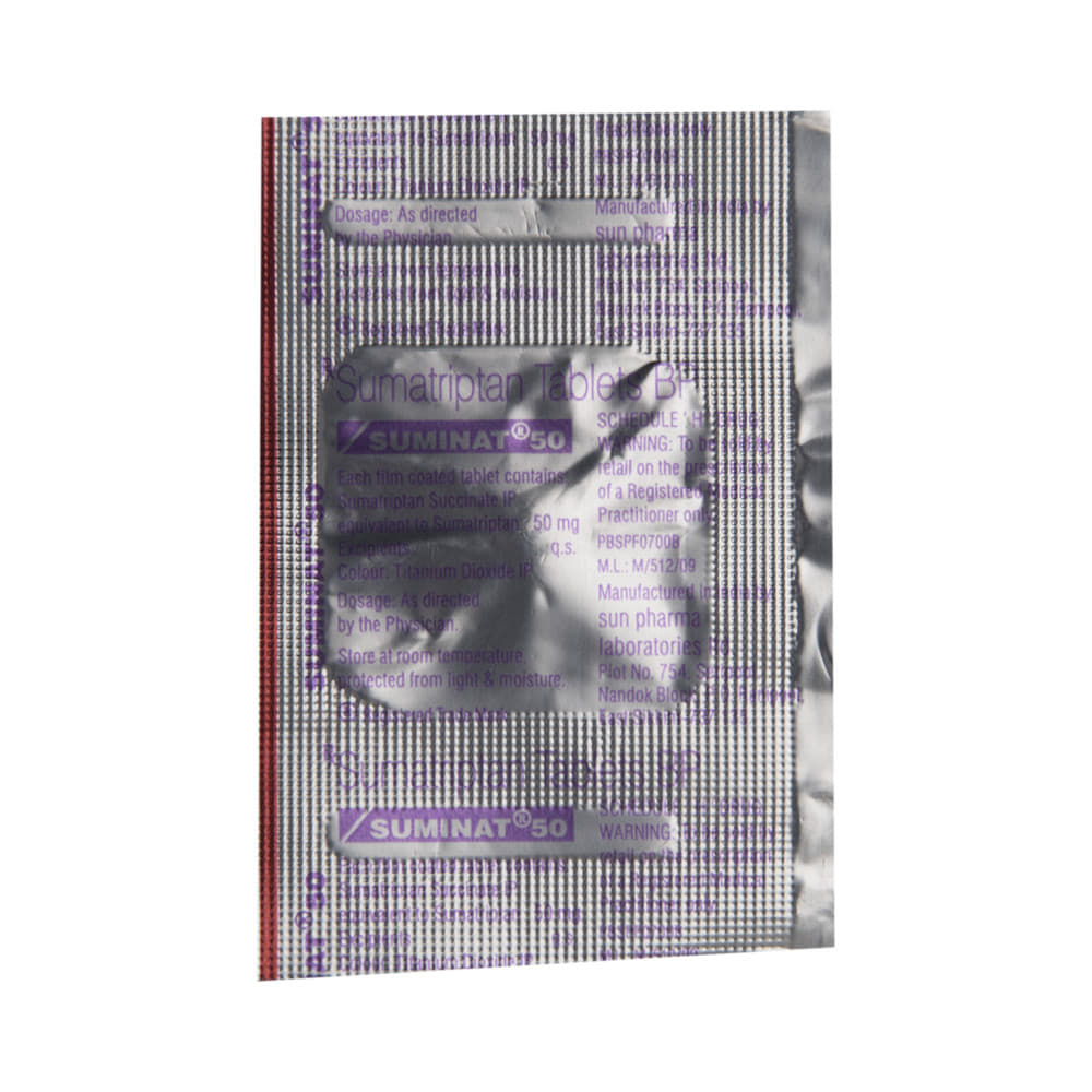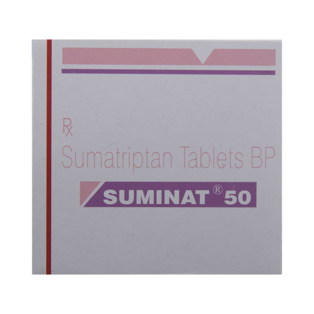 Suminat 50 Tablet is used in the treatment of migraines. It relieves the symptoms of migraine and prevents the attack from becoming worse. This medicine helps by narrowing the blood vessels, thereby relieving migraine headaches. Suminat 50 Tablet may be taken with or without food. However, it is advised to take it at the same time each day as this helps to maintain a consistent level of medicine in the body. Do not skip any doses and finish the full course of treatment even if you feel better and if you have missed a dose, take it as soon as you remember. You should continue to take this medicine for as long as the doctor advises and do not stop taking it suddenly.Side effects associated with the use of this medicine include dizziness, weakness, drowsiness, peripheral neuropathy (tingling and numbness of feet and hands), and flushing (sense of warmth in the face, ears, neck, and trunk). However, these are usually temporary and usually resolve on their own. Please consult your doctor if these do not subside or worry you.It may also cause sleepiness at the beginning of your treatment, so do not drive, operate machinery, until you know how this medicine affects you. This medicine may cause changes in your mood and you may feel depressed, therefore, regular monitoring of behavior is important. Pregnant or breastfeeding mothers should consult their doctor before taking this medicine.Inform your doctor if you are suffering from any heart problems, as the use of Suminat 50 Tablet is contraindicated in some heart diseases. Regular monitoring of blood pressure is required while taking this medicine. Consult your doctor and stop this medicine if you develop severe chest or stomach pain, bloody diarrhea, or significantly high blood pressure, after taking this medicine.