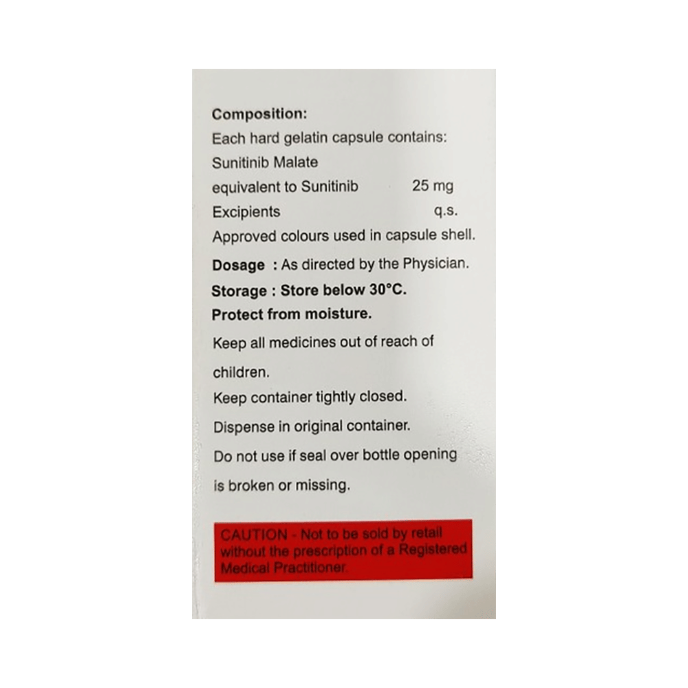 Sunitigen 25 Capsule is an anti-cancer medication. It works by binding and blocking certain cell surface protein (tyrosine kinase) responsible for the propagation of cancer growth. It also restricts the growth of new blood vessels within the tumor. This is how it prevents the proliferation of malignant cancers.