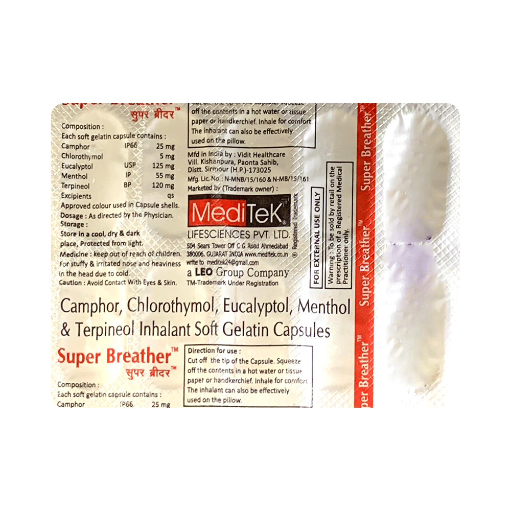Super Breather Inhalant Soft Gelatin Capsule is a medicine used to relieve common cold symptoms, such as nasal congestion, irritated nose, and overall discomfort. It decongests and clears the nasal passage, making it easier to breathe, and provides a soothing effect. It also has antimicrobial properties that helps in reducing infection. Use Super Breather Inhalant Soft Gelatin Capsule in the dose and duration provided by the doctor. For maximum benefits, drink plenty of water and stay hydrated, get plenty of rest, and maintain a humid environment to keep nasal passages moist. Avoid exposure to cold air, which can worsen congestion.Use of Super Breather Inhalant Soft Gelatin Capsule may cause mild irritation of the nasal passages or throat, a burning sensation, or watery eyes in some people. These side effects are usually temporary. To prevent or minimize these effects, avoid direct contact with the eyes and use the inhalant as directed. If you experience persistent or severe irritation, discontinue use and consult your doctor.Before using Super Breather Inhalant Soft Gelatin Capsule, inform your doctor if you have any allergies or respiratory conditions such as asthma. Avoid using this medicine if you have a known history of allergic reactions to any of its ingredients. Do not ingest the capsule contents; it is meant for inhalation only.