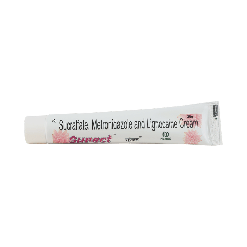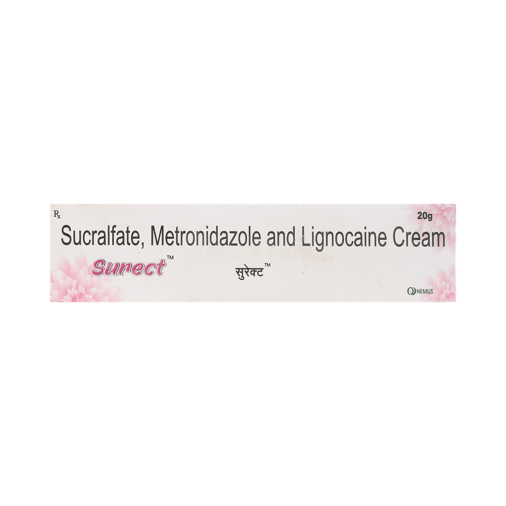 Surect Cream is a combination of three medicines: Lidocaine, Metronidazole and sucralfate. Lidocaine is a local anesthetic. It works by blocking pain signals from the nerves to the brain which decreases pain sensation. Metronidazole is an antibiotic that kills any harmful bacteria in the anal region and prevents infections. Sucralfate is a protective agent that forms a protective layer on the skin of the anal region and prevents any irritation, pain or burning sensation in the anus. This promotes wound healing and formation of new healthy skin.