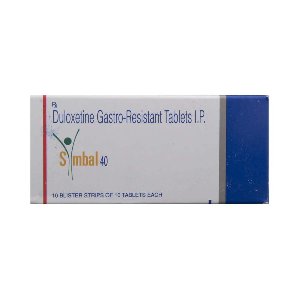 Symbal 40 Tablet is used in the treatment of depression, anxiety disorder, diabetic nerve pain, fibromyalgia (a condition in which there are generalized pain and tenderness in the body), neuropathic pain, and stress urinary incontinence. Symbal 40 Tablet works by increasing the level of chemical messengers (serotonin and noradrenaline) in the brain that have a calming effect on the brain and relax the nerves, thus treating your illness. It may be taken with or without food. It is advised to take this medicine at a fixed time each day to maintain a consistent level in the blood. If you miss any doses, take it as soon as you remember. Do not skip any doses and finish the full course of treatment even if you feel better. This medication mustn't be stopped suddenly as it may worsen your symptoms.Some common side effects of this medicine include nausea, headache, decreased libido, abnormal dreams, blurred vision, and dry mouth. It even causes dizziness and sleepiness, so do not drive or do anything that requires mental focus until you know how this medicine affects you. However, these side effects are temporary and usually resolve on their own in some time. Please consult your doctor if these do not subside or bother you.Before taking Symbal 40 Tablet, inform your doctor if you have any problems with your kidneys, heart, liver, or have a history of seizures (epilepsy or fits). Inform your doctor if you develop any unusual changes in mood or behavior, new or worsening depression, or if you have any suicidal thoughts.