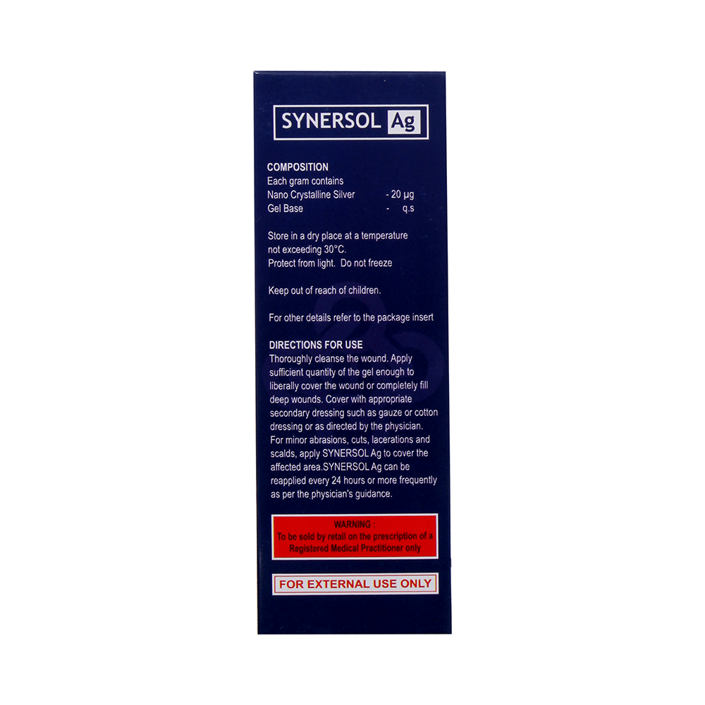 Synersol Ag Gel is a medicine that is used in the treatment of burns and wound infections. It helps kill or stop the growth of harmful bacteria. This helps reduce the risk of infection in burns and wounds and promotes faster healing. Use Synersol Ag Gel exactly as directed by your doctor. Clean the affected area gently and make sure it is dry. Then apply a thin layer of medicine over the affected area. Wash your hands before and after applying it to avoid spreading germs. For best results, use it regularly as prescribed and do not stop the treatment early, even if the wound starts to improve. Keep the treated area clean, avoid scratching or touching it, and follow any additional care instructions given by your doctor.Synersol Ag Gel is usually well tolerated, but some people may experience mild side effects. These may include slight burning, itching, redness, or irritation at the site of application. These effects are generally mild and go away on their own. If you notice any worsening of symptoms or signs of an allergic reaction, such as a rash, swelling, or severe itching, stop using the medicine and seek medical advice.Before using Synersol Ag Gel, let your doctor know if you are allergic to silver or any ingredients in the medicine. Avoid getting it into your eyes, mouth, or deep wounds unless your doctor has advised it. Do not use other topical products on the same area unless told to do so, as this may interfere with the medicine’s action. If you are pregnant, breastfeeding, or have any other medical conditions, discuss with your doctor before starting the treatment.