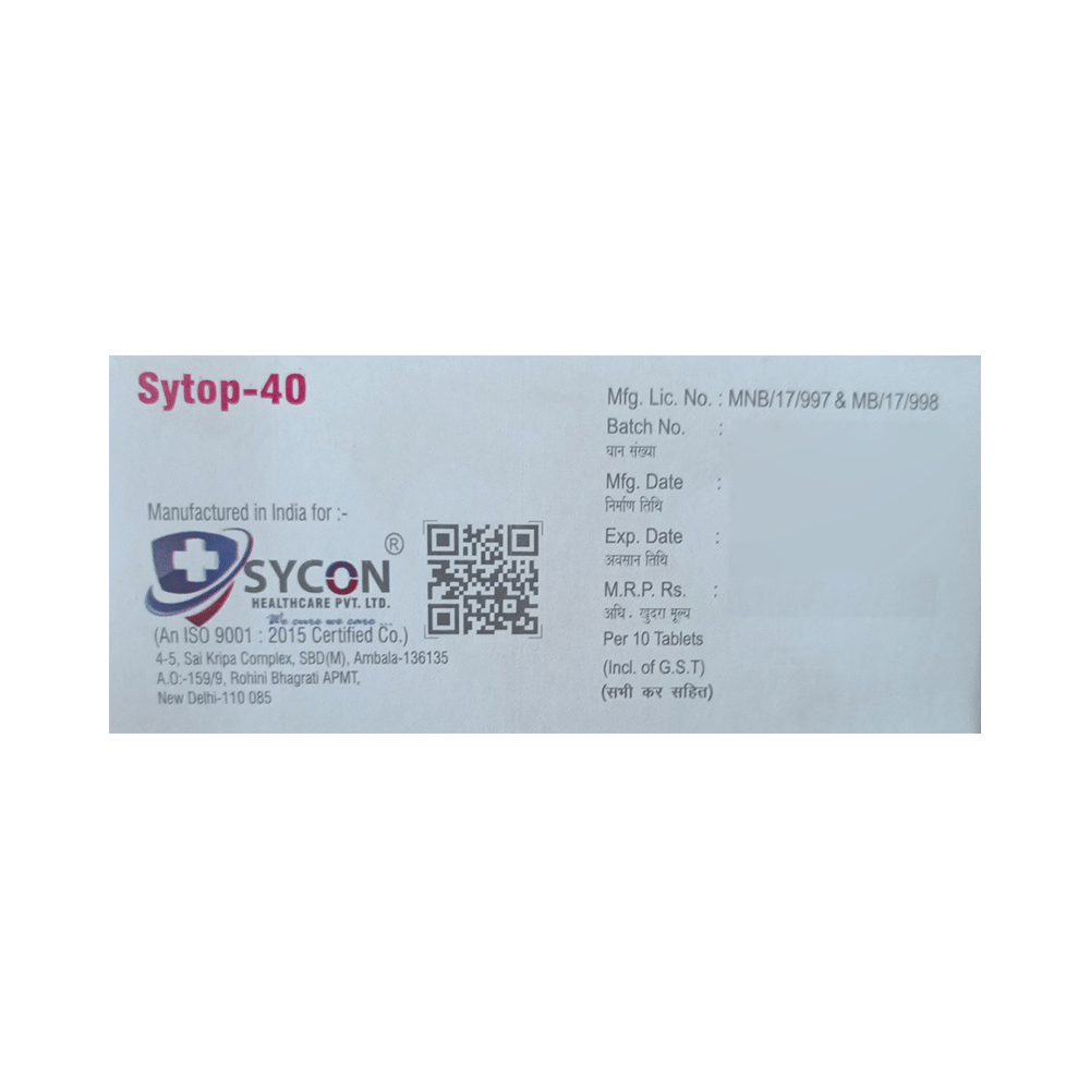 Sytop 40 Tablet is a proton pump inhibitor (PPI). It works by reducing the amount of acid in the stomach which in turn relieves acid-related indigestion and heartburn.