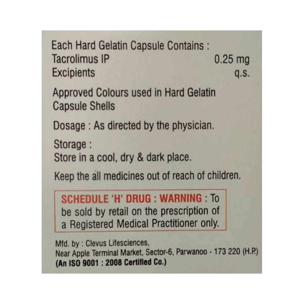 Tacren 0.25 Capsule is an immunosuppressant. It works by suppressing your body’s immune response following the transplant of an organ (e.g., liver, kidney, heart). This helps your body to accept the new organ as if it were your own.
