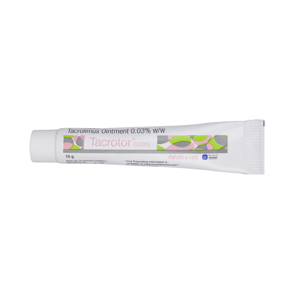 Tacrotor 0.03% Ointment is used to treat eczema (atopic dermatitis). It works by suppressing the activity of certain immune cells that cause inflammation (redness and swelling) of the skin. This relieves itching and improves rashes in atopic dermatitis. Tacrotor 0.03% Ointment is used for external use. It should be used 2-4 times a day on the affected area or use it as suggested by the doctor. It should be applied slowly and evenly to the skin until it is rubbed in. You should not use it too often and you should not cover the treated area with a bandage or plaster. You must inform your doctor if there’s no improvement even after two weeks of treatment or if the skin gets worse.Use of this medicine may cause some common side effects like erythema, headache, inflammation of hair follicle, and application site reaction like burning, irritation, itching, and redness. This medicine is not normally recommended during pregnancy or while breastfeeding unless it is clearly needed.