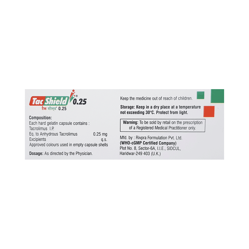 Tacshield 0.25 Capsule is used along with other medicines to prevent your body from rejecting a new organ (e.g., liver, kidney, or heart) after transplant. It does so by weakening your body’s immune system, so it does not attack the new organ. This medication belongs to a class of drugs known as immunosuppressants. The amount of Tacshield 0.25 Capsule you take and how often you take it depends on the type of transplant you have, your body weight, and what other medicines you are taking. Follow your doctor’s instructions carefully. You should take it on an empty stomach, at least 1 hour before or 2 hours after a meal. Take this medicine regularly to get the maximum benefit and keep taking it, even if you feel well. If you stop taking it, you may increase the chances of rejecting your transplanted organ.Tacshield 0.25 Capsule has many potential side effects. It can cause or worsen diabetes and kidney problems. These need urgent medical attention. Other common side effects include tremor, infections, high blood pressure, headache, and insomnia. If the side effects do not go away or get worse, tell your doctor. Tacshield 0.25 Capsule lowers your immune system making you susceptible to catching more infections than usual.Before taking this medicine, tell your doctor if you have kidney, liver, or heart problems, diabetes, or high blood pressure. Also let your doctor know what other medications you are taking, especially for infections, pain, and arthritis. These and others may affect, or be affected by, this medicine. You should limit your exposure to the sun and UV (ultraviolet) light while taking it because immunosuppressants could increase your risk of skin cancer.Both men and women using this medicine should use effective birth control to prevent pregnancy. This medicine is not normally recommended during pregnancy or while breastfeeding unless it is clearly needed. Before and during treatment you will need frequent medical tests to monitor your progress, and your blood pressure will need to be checked often.