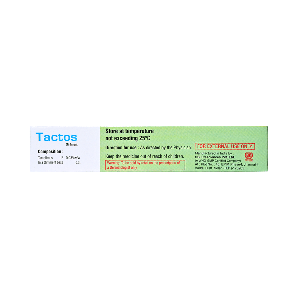 Tactos Ointment is an immunosuppressant. It works by suppressing the activity of certain immune cells that cause inflammation (redness and swelling) of the skin. This relieves itching and improves rashes in atopic dermatitis.