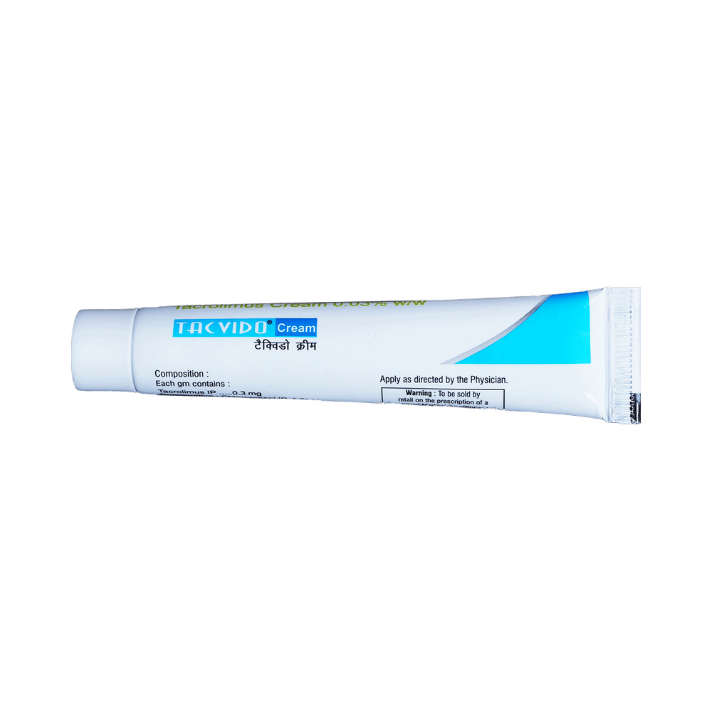 Tacvido Cream is used to treat eczema (atopic dermatitis). It works by suppressing the activity of certain immune cells that cause inflammation (redness and swelling) of the skin. This relieves itching and improves rashes in atopic dermatitis. Tacvido Cream is used for external use. It should be used 2-4 times a day on the affected area or use it as suggested by the doctor. It should be applied slowly and evenly to the skin until it is rubbed in. You should not use it too often and you should not cover the treated area with a bandage or plaster. You must inform your doctor if there’s no improvement even after two weeks of treatment or if the skin gets worse.Use of this medicine may cause some common side effects like erythema, headache, inflammation of hair follicle, and application site reaction like burning, irritation, itching, and redness. This medicine is not normally recommended during pregnancy or while breastfeeding unless it is clearly needed.
