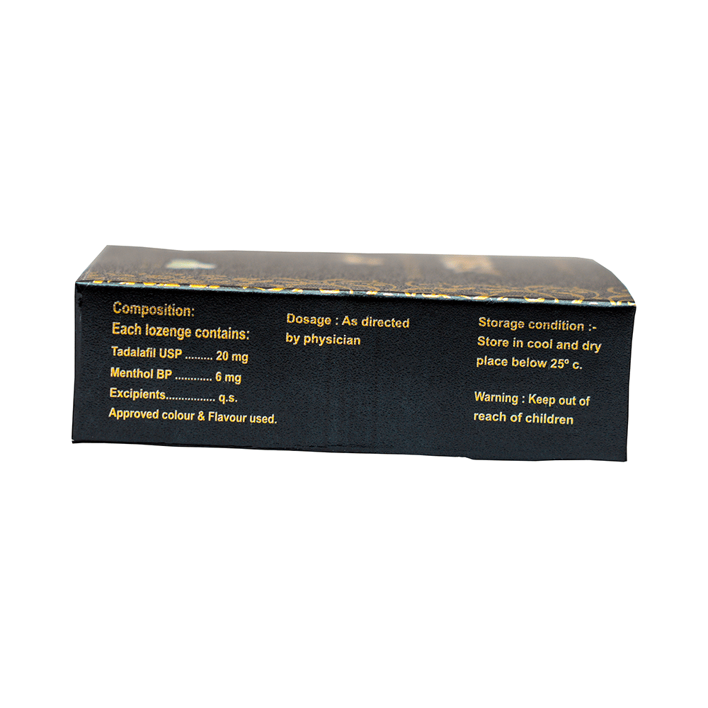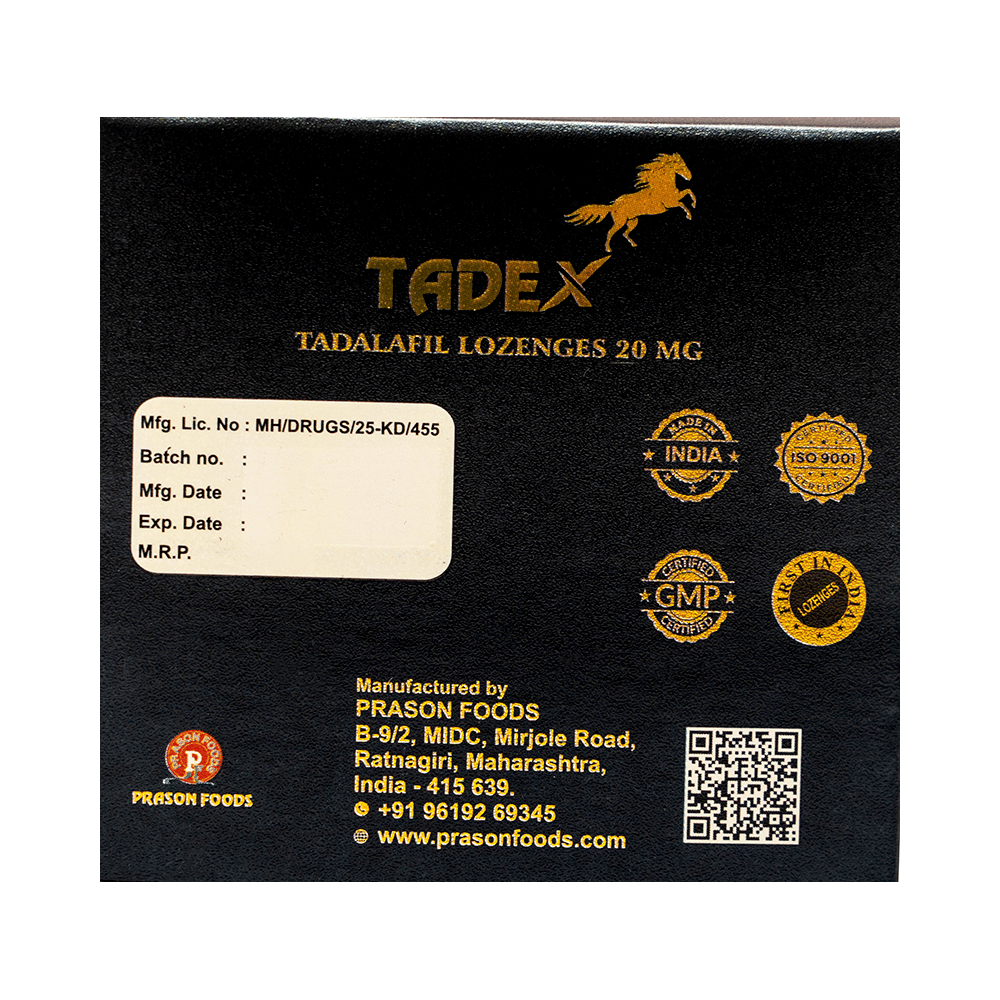 Tadex Lozenges (2 Each) Mint is used to treat erectile dysfunction (ED) in men and pulmonary arterial hypertension (PAH). It increases blood flow to the penis to help men get an erection. In PAH, it relaxes or widens the blood vessels inside the lungs, which reduces blood pressure in the lungs. Tadex Lozenges (2 Each) Mint may be taken on an empty stomach or with a meal. It should be strictly taken as advised by your doctor. The medicine when taken for ED will only help you to get an erection if you are sexually stimulated. You should take it about one hour before you plan to have sex. The amount of time it takes to work varies from person to person, but it normally takes between 30 minutes and one hour. Only take it if you need it and it has been prescribed to you by a doctor.The most common side effects of this medicine are flushing, headache, blurred vision, muscle pain, stomach upset, nausea, back pain, and respiratory tract infection. Talk to your doctor if the side effects bother you or will not go away.Tadex Lozenges (2 Each) Mint can be dangerous to take it along with medicines called nitrates (often given for chest pain). Do not take this medicine if you have severe heart or liver problems, if you have recently had a stroke or heart attack or if you have low blood pressure. Let your doctor know if you suffer from these or any other health problems before taking it. You should not drive if this medicine makes you feel dizzy. Avoid drinking alcohol while taking this medicine as it can lead to side effects.