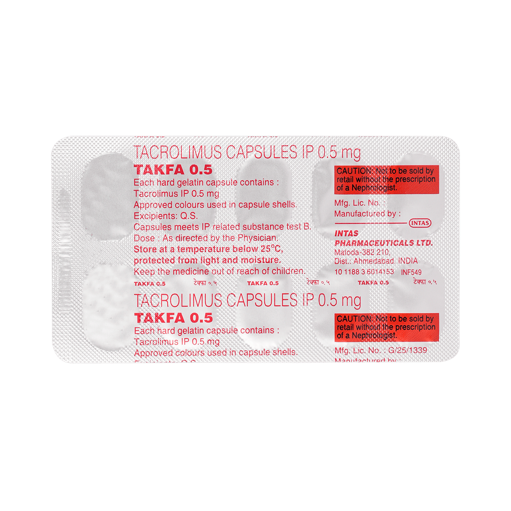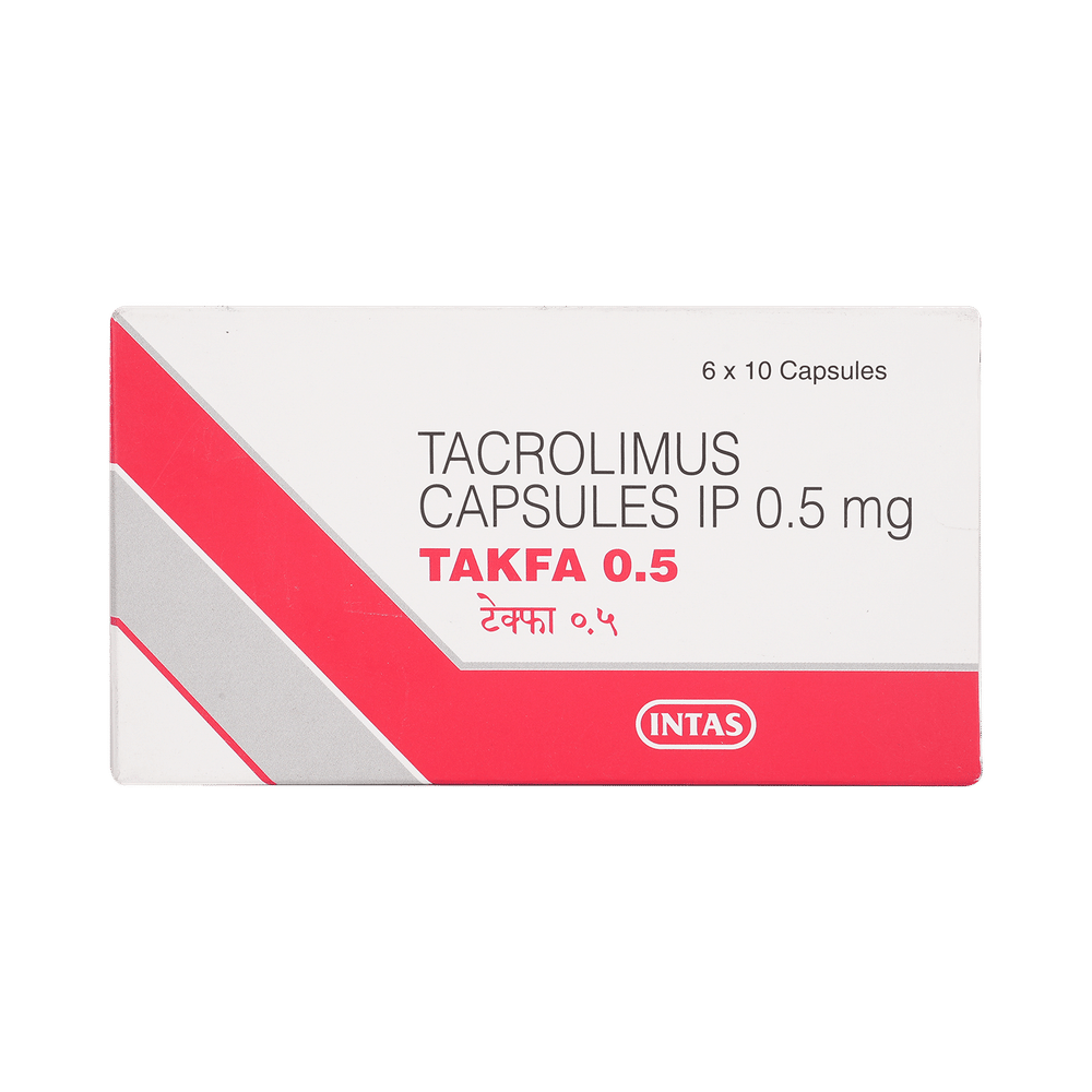 Takfa 0.5 Capsule is used along with other medicines to prevent your body from rejecting a new organ (e.g., liver, kidney, or heart) after transplant. It does so by weakening your body’s immune system, so it does not attack the new organ. This medication belongs to a class of drugs known as immunosuppressants. The amount of Takfa 0.5 Capsule you take and how often you take it depends on the type of transplant you have, your body weight, and what other medicines you are taking. Follow your doctor’s instructions carefully. You should take it on an empty stomach, at least 1 hour before or 2 hours after a meal. Take this medicine regularly to get the maximum benefit and keep taking it, even if you feel well. If you stop taking it, you may increase the chances of rejecting your transplanted organ.Takfa 0.5 Capsule has many potential side effects. It can cause or worsen diabetes and kidney problems. These need urgent medical attention. Other common side effects include tremor, infections, high blood pressure, headache, and insomnia. If the side effects do not go away or get worse, tell your doctor. Takfa 0.5 Capsule lowers your immune system making you susceptible to catching more infections than usual.Before taking this medicine, tell your doctor if you have kidney, liver, or heart problems, diabetes, or high blood pressure. Also let your doctor know what other medications you are taking, especially for infections, pain, and arthritis. These and others may affect, or be affected by, this medicine. You should limit your exposure to the sun and UV (ultraviolet) light while taking it because immunosuppressants could increase your risk of skin cancer.Both men and women using this medicine should use effective birth control to prevent pregnancy. This medicine is not normally recommended during pregnancy or while breastfeeding unless it is clearly needed. Before and during treatment you will need frequent medical tests to monitor your progress, and your blood pressure will need to be checked often.