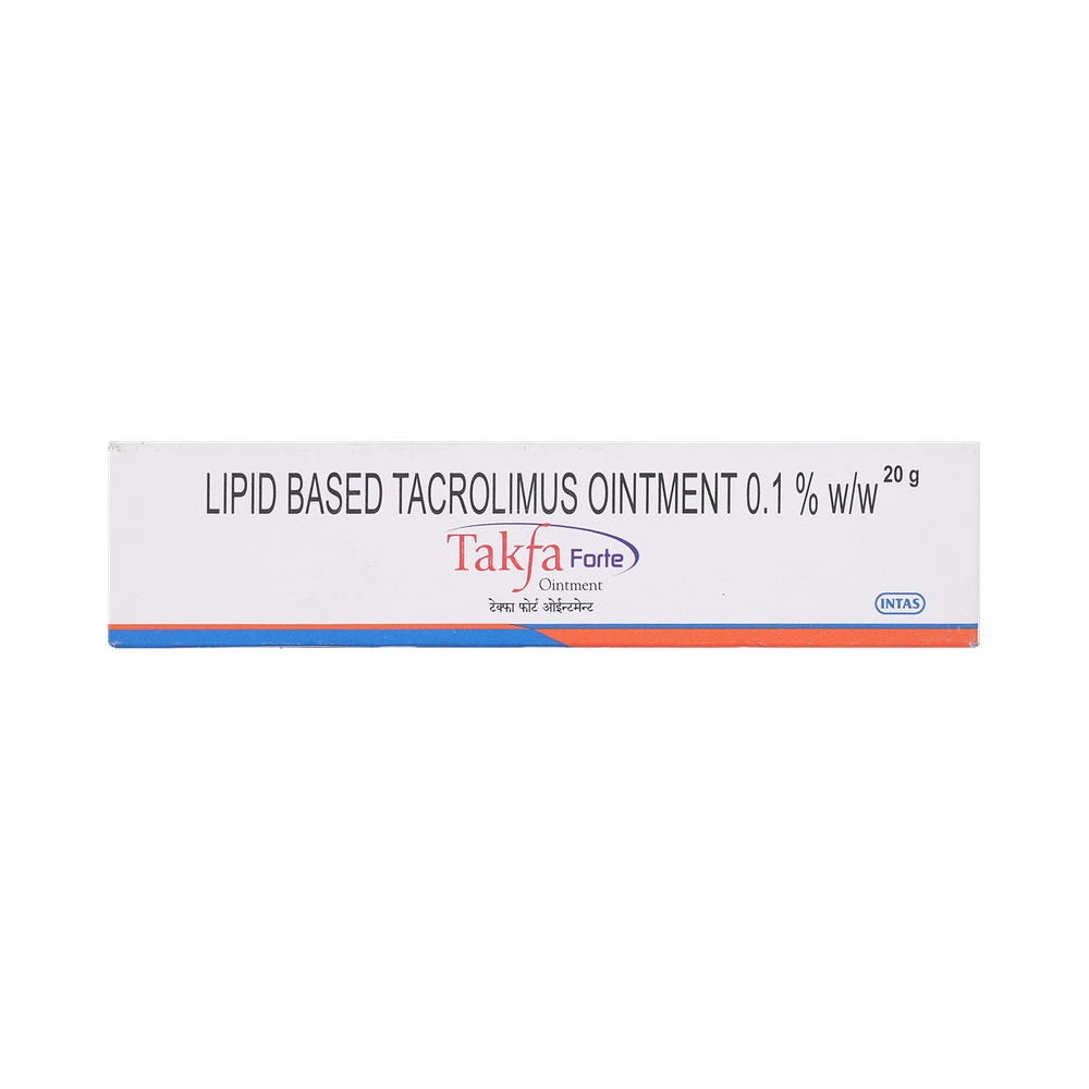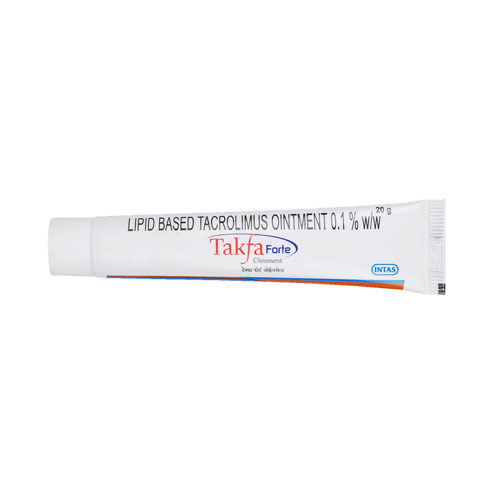 Takfa Forte Ointment is used to treat eczema (atopic dermatitis). It works by suppressing the activity of certain immune cells that cause inflammation (redness and swelling) of the skin. This relieves itching and improves rashes in atopic dermatitis. Takfa Forte Ointment is used for external use. It should be used 2-4 times a day on the affected area or use it as suggested by the doctor. It should be applied slowly and evenly to the skin until it is rubbed in. You should not use it too often and you should not cover the treated area with a bandage or plaster. You must inform your doctor if there’s no improvement even after two weeks of treatment or if the skin gets worse.Use of this medicine may cause some common side effects like erythema, headache, inflammation of hair follicle, and application site reaction like burning, irritation, itching, and redness. This medicine is not normally recommended during pregnancy or while breastfeeding unless it is clearly needed.