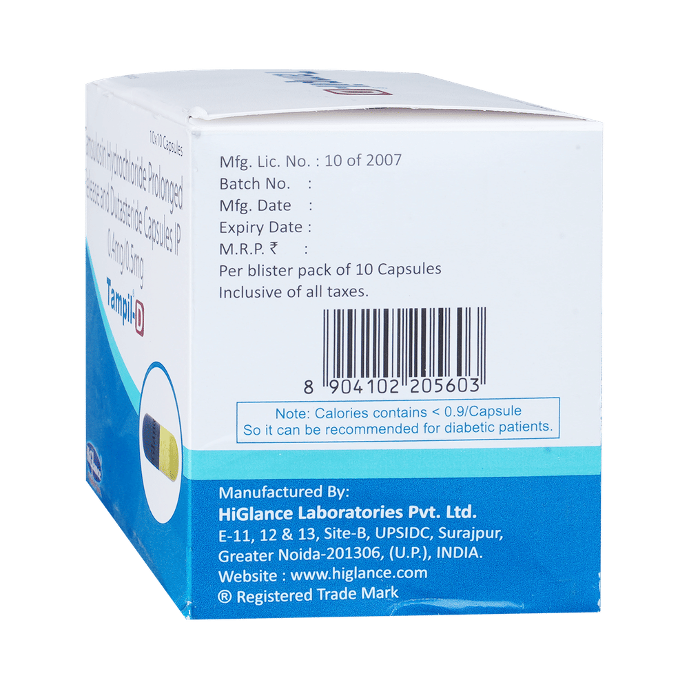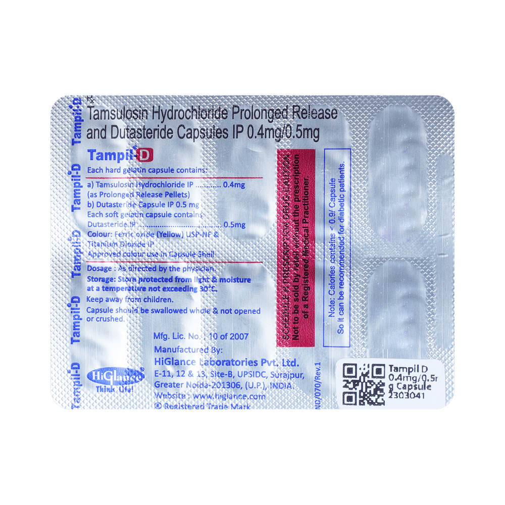 In Treatment of Benign prostatic hyperplasiaWhen your prostate gland becomes enlarged it can cause urinary problems such as difficulty passing urine and a need to go to the toilet frequently or urgently. It can also cause urine flow to be slower. If not treated, there is a risk that your urine flow will be completely blocked. Tampil D 0.4mg/0.5mg Capsule PR is a combination of two medicines: dutasteride and tamsulosin. Dutasteride reduces the size of your prostate by blocking the production of a hormone which causes it to grow. Tamsulosin works by relaxing muscles in the bladder and prostate. Together they can rapidly relieve the symptoms and make it easier for you to urinate. However, it may take up to 6 months to notice the full benefit. Take this medicine exactly as prescribed for maximum benefits.