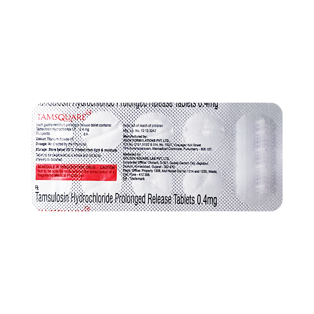 Tamsquare Tablet is an alpha-adrenergic antagonist that is used in the treatment of benign prostatic hyperplasia. It helps to relieve symptoms like difficulty in passing urine. However, it does not decrease the size of the prostate. Tamsquare Tablet is advised to take it in a dose and duration as per prescription. It may be taken with or without food, but take at the same time regularly. Swallow the medicine as a whole without crushing or chewing it. You should not stop taking the medicine without consulting the doctor as it may lead to the worsening of your symptoms. The course of the treatment should be completed for better efficacy of the medicine.Use of this medicine can cause some common side effects such as dizziness, backe pain, chest pain, ejaculation disorder, and retrograde ejaculation. If any of the side effects persist or bother you, you must consult the doctor without delay.Simple lifestyle changes can help you manage your symptoms better. Try to urinate as soon as you feel the urge, however, never strain or push to empty your bladder. You should avoid drinking caffeinated or alcoholic drinks at night and a few hours before going to bed or going out.Before receiving the treatment, inform your doctor if you are on any medication for any other health condition. If you have to undergo eye surgery due to cataracts or glaucoma then inform your eye doctor about the usage of this medicine. Patients with liver disease must be cautious while receiving the prescription, and they must receive regular follow-ups as per the doctor’s advice.