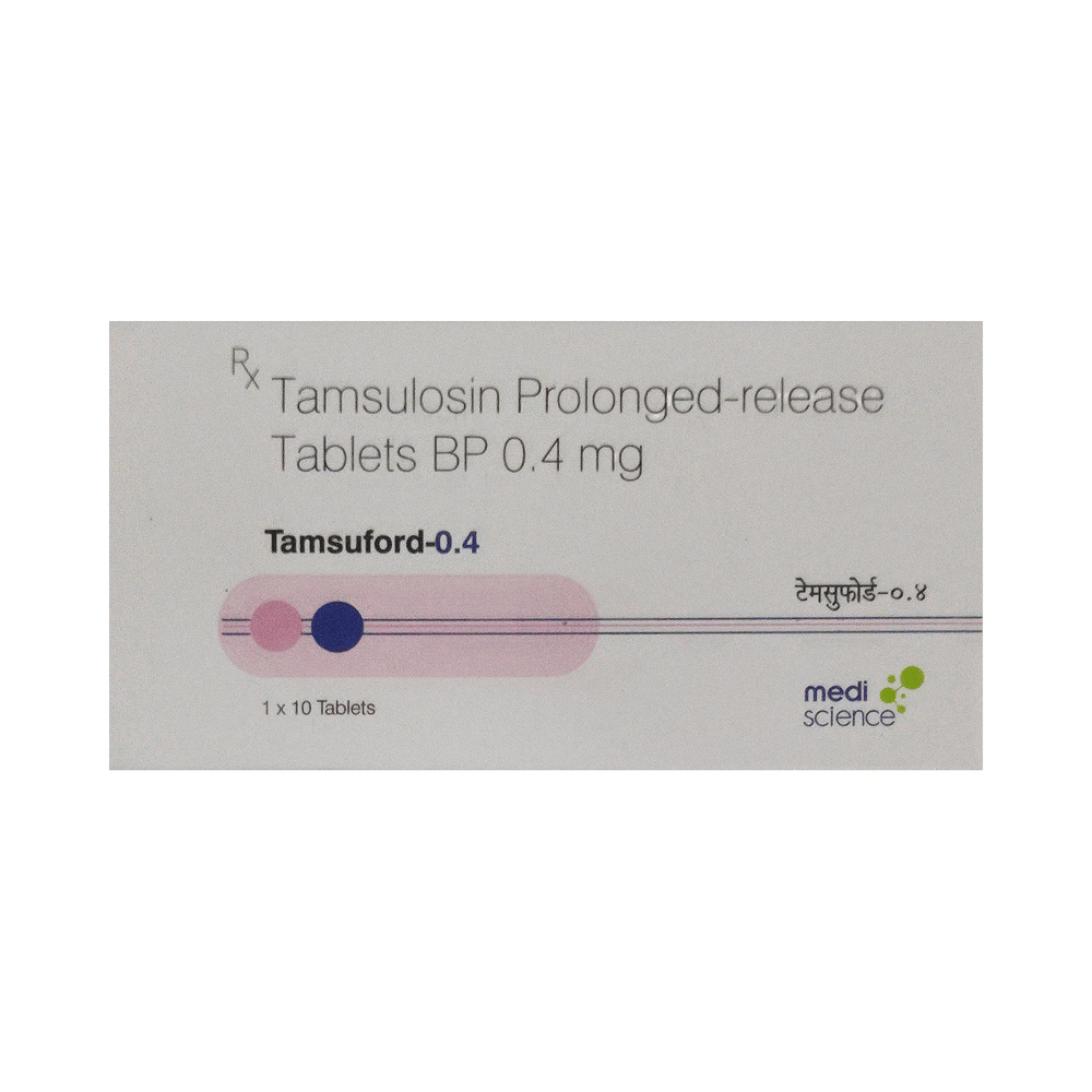 Tamsuford 0.4mg Tablet is an alpha-adrenergic antagonist that is used in the treatment of benign prostatic hyperplasia. It helps to relieve symptoms like difficulty in passing urine. However, it does not decrease the size of the prostate. Tamsuford 0.4mg Tablet is advised to take it in a dose and duration as per prescription. It may be taken with or without food, but take at the same time regularly. Swallow the medicine as a whole without crushing or chewing it. You should not stop taking the medicine without consulting the doctor as it may lead to the worsening of your symptoms. The course of the treatment should be completed for better efficacy of the medicine.Use of this medicine can cause some common side effects such as dizziness, backe pain, chest pain, ejaculation disorder, and retrograde ejaculation. If any of the side effects persist or bother you, you must consult the doctor without delay.Simple lifestyle changes can help you manage your symptoms better. Try to urinate as soon as you feel the urge, however, never strain or push to empty your bladder. You should avoid drinking caffeinated or alcoholic drinks at night and a few hours before going to bed or going out.Before receiving the treatment, inform your doctor if you are on any medication for any other health condition. If you have to undergo eye surgery due to cataracts or glaucoma then inform your eye doctor about the usage of this medicine. Patients with liver disease must be cautious while receiving the prescription, and they must receive regular follow-ups as per the doctor’s advice.
