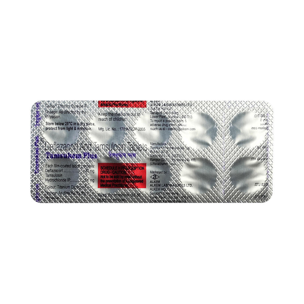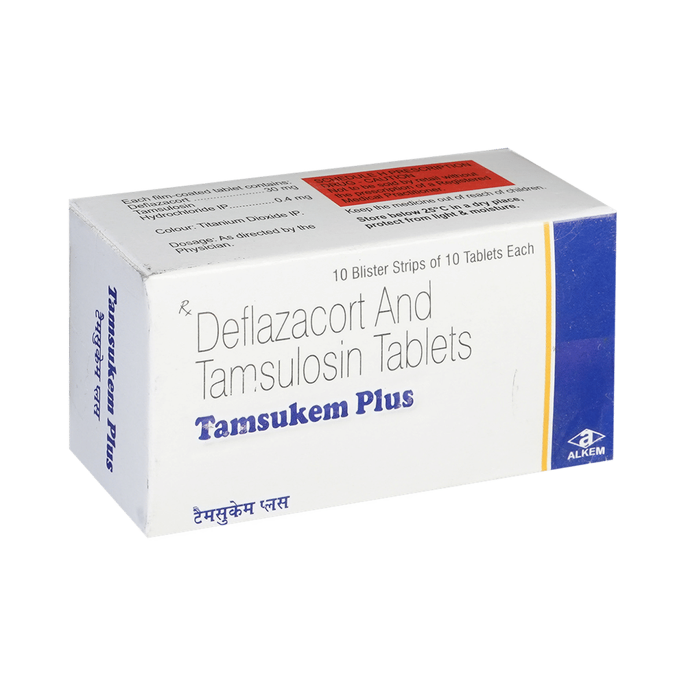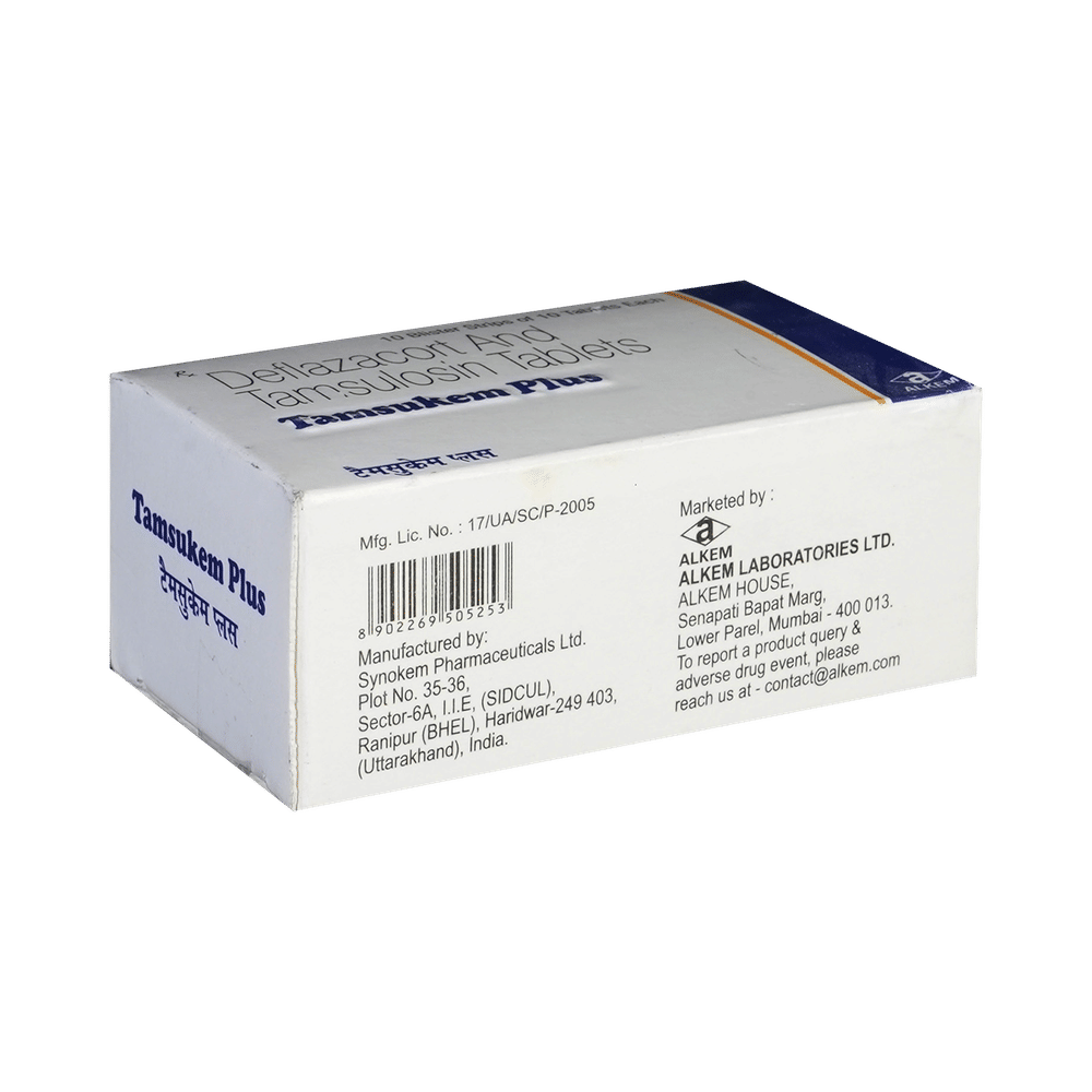 Tamsukem Plus Tablet is a combination of two medicines: Tamsulosin and Deflazacort. Tamsulosin is an alpha-blocker. It works by relaxing the muscle around the bladder exit and prostate gland so as to allow easy passage of urine. Deflazacort is a steroid medicine. It works by reducing inflammation (swelling) in the kidneys to promote the passage of the stones through urine.