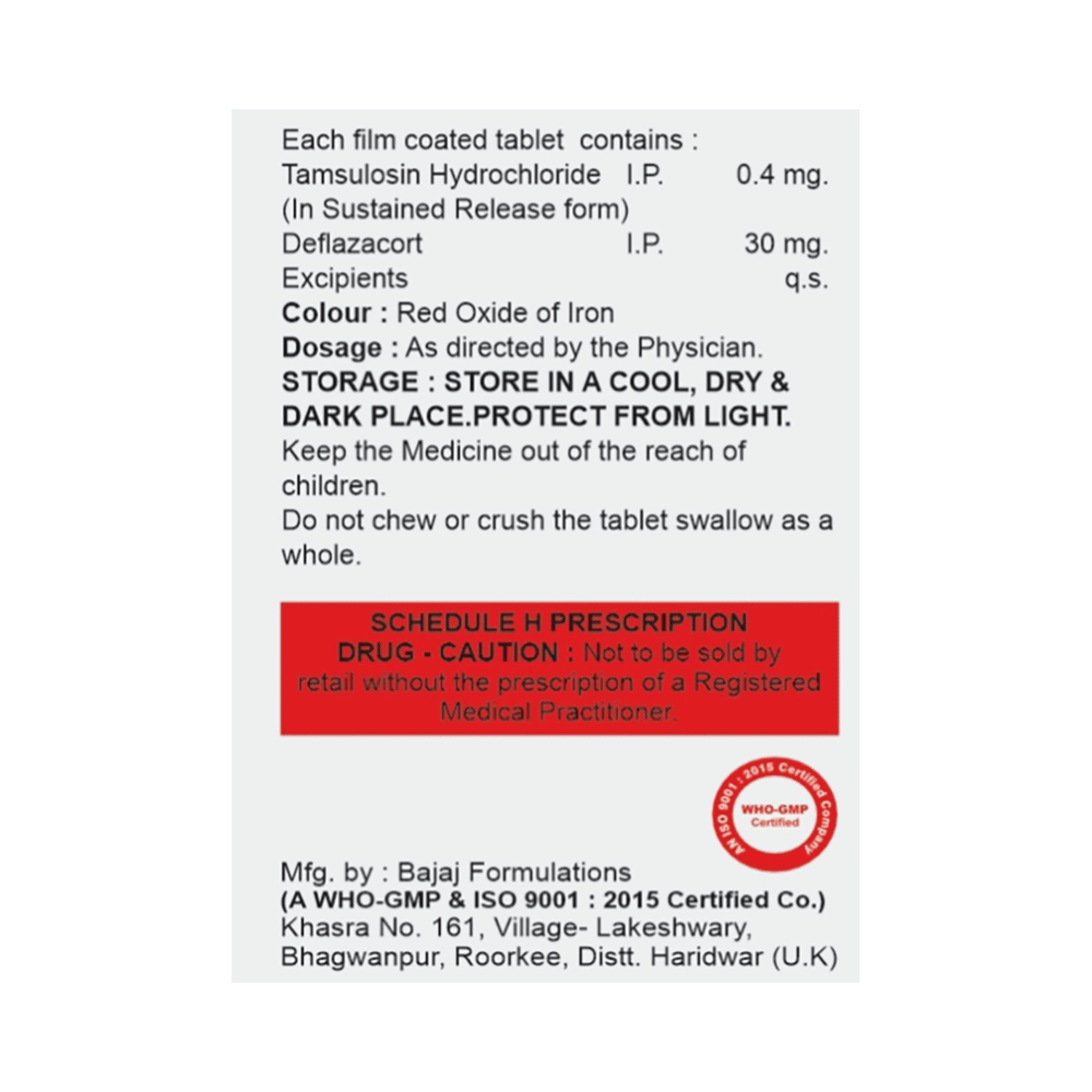 Salt Composition: Tamsulosin (0.4mg) + Deflazacort (30mg)