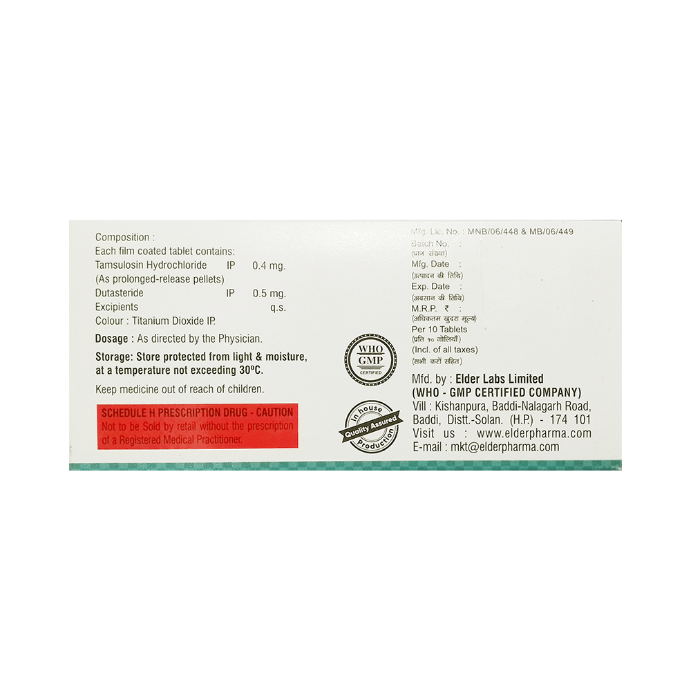 In Treatment of Benign prostatic hyperplasiaWhen your prostate gland becomes enlarged it can cause urinary problems such as difficulty passing urine and a need to go to the toilet frequently or urgently. It can also cause urine flow to be slower. If not treated, there is a risk that your urine flow will be completely blocked. Tamsulin D Tablet PR is a combination of two medicines: dutasteride and tamsulosin. Dutasteride reduces the size of your prostate by blocking the production of a hormone which causes it to grow. Tamsulosin works by relaxing muscles in the bladder and prostate. Together they can rapidly relieve the symptoms and make it easier for you to urinate. However, it may take up to 6 months to notice the full benefit. Take this medicine exactly as prescribed for maximum benefits.