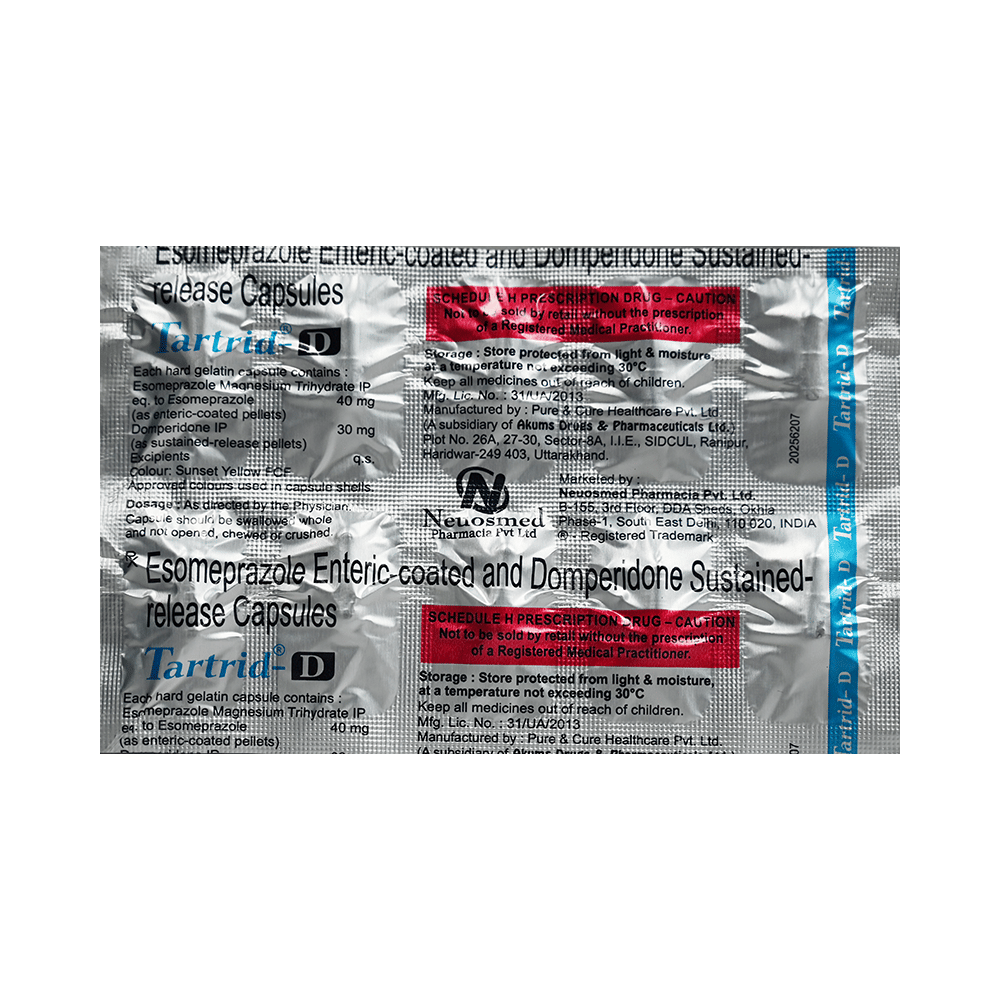Tartrid-D Capsule SR is a combination of two medicines: Domperidone and Esomeprazole. Domperidone is a prokinetic that works on the upper digestive tract to increase the movement of the stomach and intestines, allowing the food to move more easily through the stomach. Esomeprazole is a proton pump inhibitor (PPI) that works by reducing the amount of acid in the stomach, which helps in the relief of acid-related indigestion and heartburn.