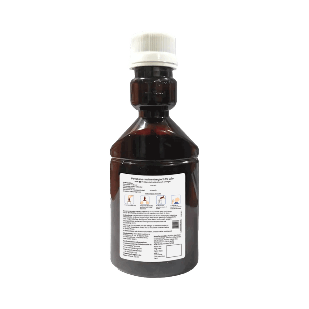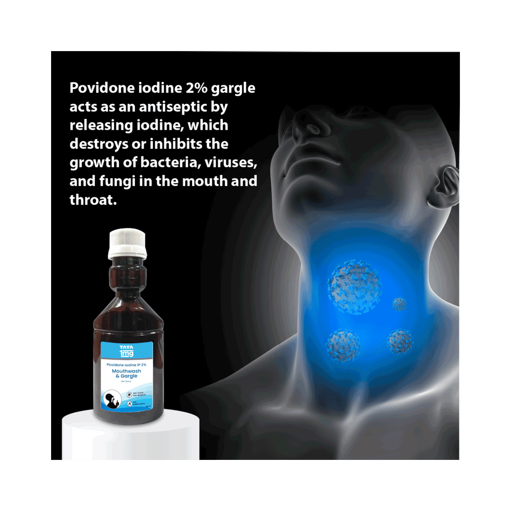 Tata 1mg 2% Gargle and Mouthwash (Povidone Iodine) Mint is an antiseptic medicine. When used as a mouthwash, it kills harmful microorganisms of your mouth. This is how it works to prevent and treat infections.