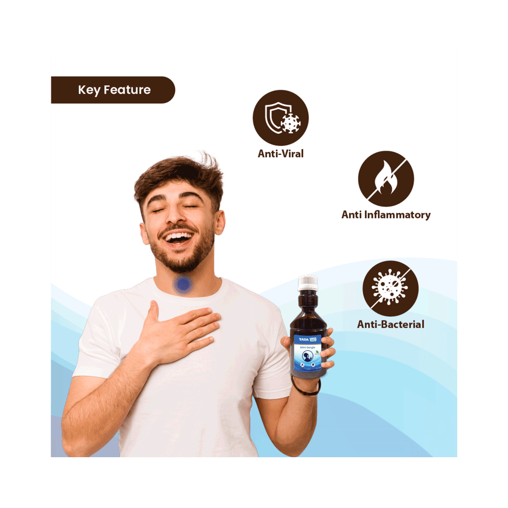 In Treatment of Sore throatSore throat refers to pain and discomfort in the throat that is usually seen in bacterial or viral infections. Tata 1mg 2% Gargle and Mouthwash (Povidone Iodine) Mint is generally very safe, works quite quickly and will reduce the pain and discomfort that might be caused by sore throat. It kills the microorganisms causing the infection in the throat and makes you feel better. This helps to soothe the irritated throat and speeds up the recovery process. You may also drink warm water/drinks such as ginger tea, avoid cold foods and take a steam bath for additional relief.In Treatment of Mouth infectionWhenever there is an overgrowth of microorganisms in our mouth, that are otherwise normally present, it can lead to unpleasant symptoms suggestive of mouth infection. These symptoms include bad breath, swollen gums, unpleasant taste changes, sensitivity of teeth to hot or cold food/liquid etc. Tata 1mg 2% Gargle and Mouthwash (Povidone Iodine) Mint kills and prevents growth of these bacteria, thereby relieving these symptoms. This helps in maintaining good oral hygiene.Poor oral hygiene can be extremely embarrassing and can affect your social life. This medicine helps restore your self confidence and makes it easier for you to go about your daily activities. Continue using it as advised by the doctor to get maximum benefit.In Treatment and prevention of Wound infectionTata 1mg 2% Gargle and Mouthwash (Povidone Iodine) Mint is a versatile antiseptic that is used for the treatment and prevention of infection. Tata 1mg 2% Gargle and Mouthwash (Povidone Iodine) Mint kills and prevents the growth of infection-causing microbes, thereby preventing abrasions, cuts, and wounds, or any break in the skin from getting infected. The antiseptic effect is caused due to the slow release of iodine. Keep the affected area clean and use the medicine as prescribed by your doctor.show moreshow less