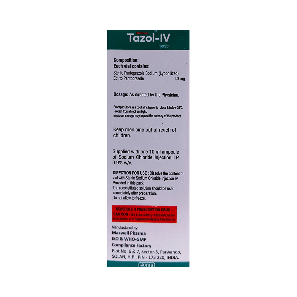 Tazol-IV Injection is a medicine that reduces the amount of acid produced in your stomach. It is used for treating acid-related diseases of the stomach and intestine such as acid reflux, peptic ulcer disease, Zollinger-Ellison syndrome. It provides relief from symptoms and promotes healing. Tazol-IV Injection is also used to prevent stress ulcers in seriously ill patients and is administered before anesthetic medication to help prevent aspiration-related complications. It belongs to a class of medicines known as proton pump inhibitors (PPIs). This medicine is administered into a vein by a healthcare professional and will only be given to you if your doctor thinks that an injection is more suitable for you at the moment than a tablet. The dose will depend on your underlying condition and how you respond to the medicine. Your doctor will decide the duration of treatment but you should keep on taking it as prescribed, even if your symptoms disappear quickly. You can increase the efficiency of the treatment by eating smaller meals more often and avoiding caffeinated drinks (like tea and coffee), and spicy or fatty foods.The most common side effects observed with this medicine include nausea, vomiting, headache, dizziness, flatulence, diarrhea, stomach pain, and thrombophlebitis (pain, redness, and swelling of the vein). These symptoms are generally mild but if they bother you or do not go away, consult your doctor. Long-term use of this medicine may lead to an increased risk of side effects. For instance, using this medicine for more than 1 year may increase your risk for bone fractures, especially with higher doses. Talk to your doctor about ways to prevent bone loss (osteoporosis), like taking calcium and vitamin D supplements.Tazol-IV Injection is not suitable for some people. Before taking this medicine, you need to tell your doctor if you have severe liver problems, are taking medicines for HIV, have ever had an allergic reaction to similar medicines in the past, or suffer from bone loss (osteoporosis). Pregnant or breastfeeding women should also consult their doctor before taking it. Avoid drinking alcohol as it makes your stomach produce excessive acid and can worsen your symptoms. Do not drive or use machinery or tools, if this medicine makes you feel dizzy or sleepy.