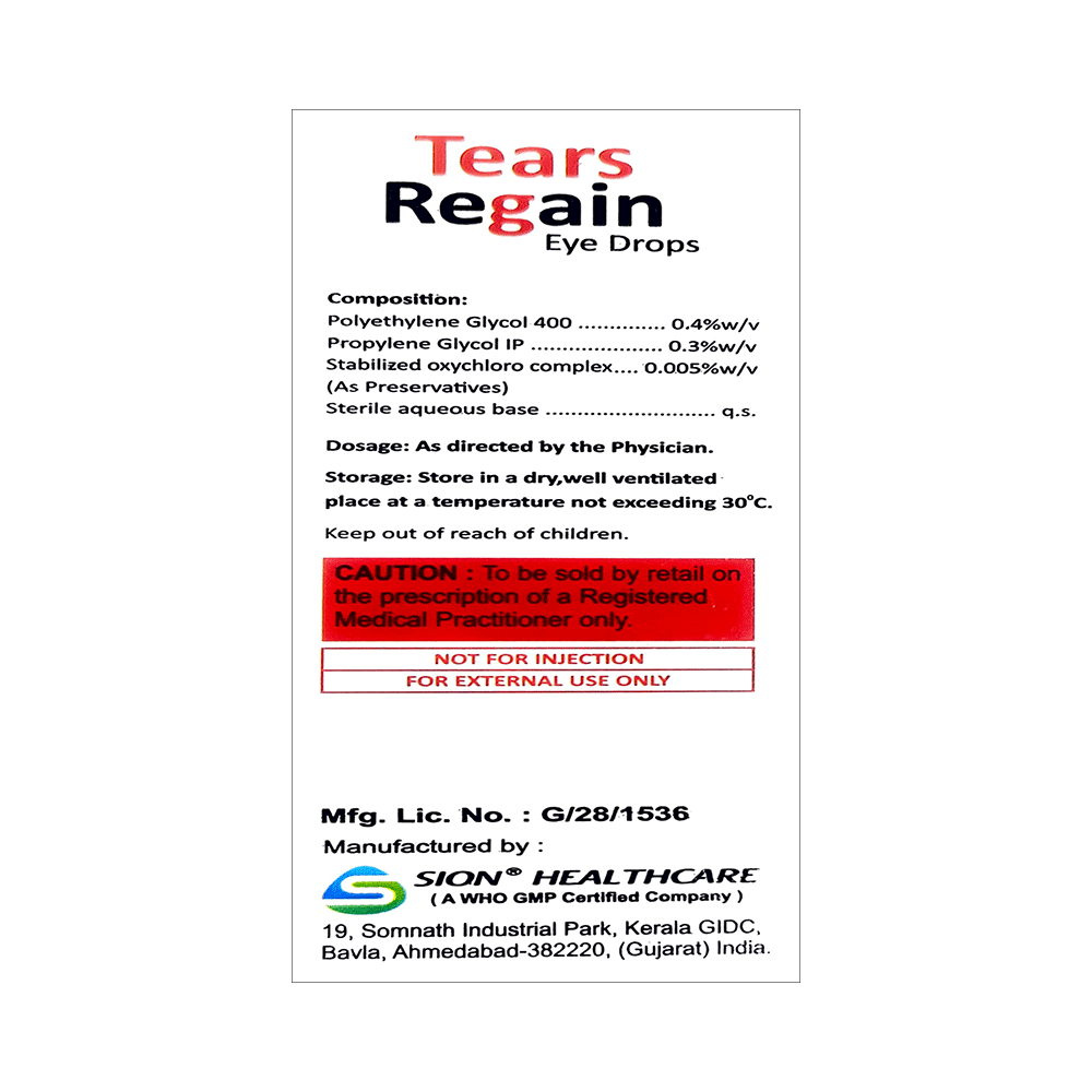 Tears Regain Eye Drop is a prescription medicine used to treat symptoms of dry eyes. It lubricates the eyes. This way it provides temporary relief from burning and discomfort caused by dry eyes. It also reduces redness and swelling of the eye. Tears Regain Eye Drop is to be used only in the affected eye in the dose and duration as advised by the doctor. Wash your hands before using this medicine. It is advised to check the label for directions before use. Do not use it too much or too little than the prescribed amount. Use it in the exact dose and duration as advised by the doctor.Use of this medicine may cause blurred vision immediately after application and minor burning, irritation, and stinging sensation at the application site. These are usually temporary and resolve with time. However, if they persist or get worse, inform your doctor. In case of accidental contact with your ears, nose, or mouth, immediately rinse it with water.Inform your doctor if you have a known allergy to any of the ingredients in this medicine or if you are taking any other medication. It is advised not to drive or operate heavy machinery immediately after using this medicine as it may cause temporary blurring of vision and may affect your ability to drive.