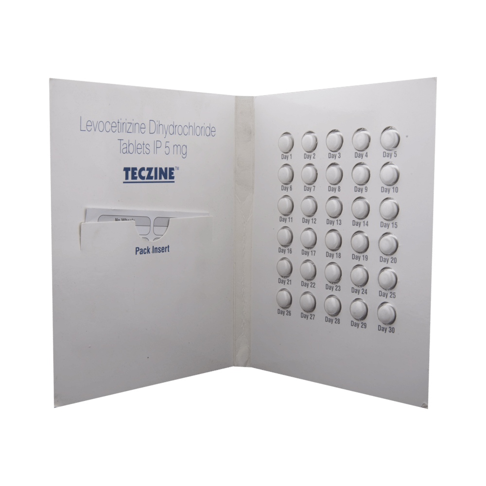 Teczine CP Tablet belongs to a group of medicines called antihistamines. It is used to treat various allergic conditions such as hay fever, conjunctivitis, some skin reactions such as eczema, hives, and reactions to bites and stings. It also relieves watery eyes, runny nose, sneezing, and itching. Teczine CP Tablet can be taken with or without food. The dose required by you may vary depending on what you are taking it for. This medicine is usually taken in the evening, but follow the advice of your doctor on how to take it. You may need this medicine only on days you have symptoms, but if you are taking it to prevent the symptoms then you should take it regularly. If you miss doses or stop taking it earlier than advised, your symptoms may come back.Common side effects include somnolence (sleepiness), dry mouth, fatigue, fever, cough, nasopharyngitis, and nosebleed. These are usually mild and go away after a couple of days as your body adjusts to it. Consult your doctor if any of the side effects persist or worry you.Before taking it, tell your doctor if you have any kidney problems or epilepsy (seizures). Your dose may need to be modified or this medicine may not suit you. Some other medicines can interact with this medicine so let your healthcare team know what else you are taking. You should also talk to your doctor before using this medicine if you are pregnant or breastfeeding, although it is not thought to be harmful.