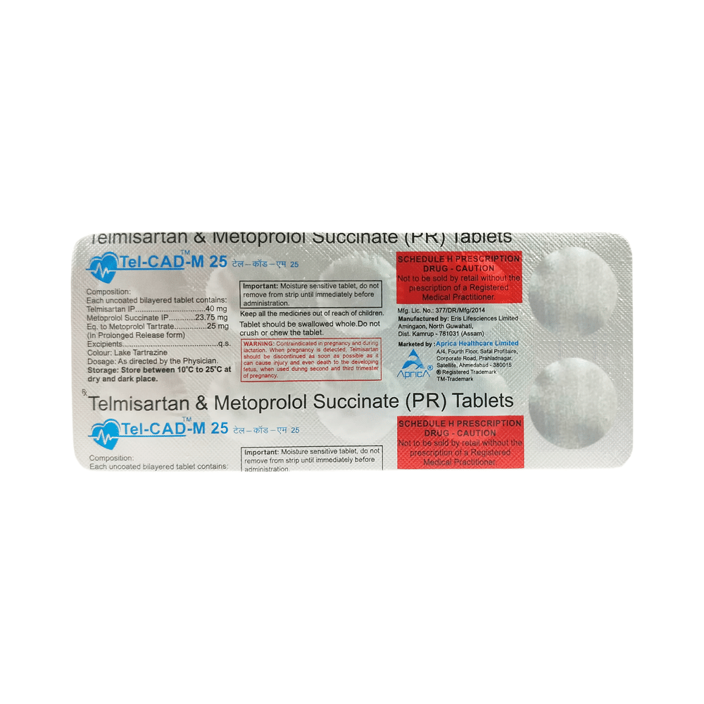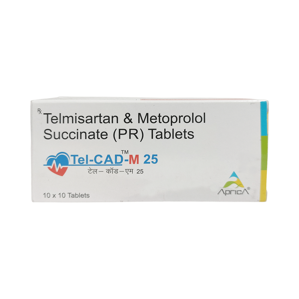 Tel Cad M 40mg/25mg Tablet is a combination of two blood-pressure lowering medicines: Telmisartan and Metoprolol Succinate.