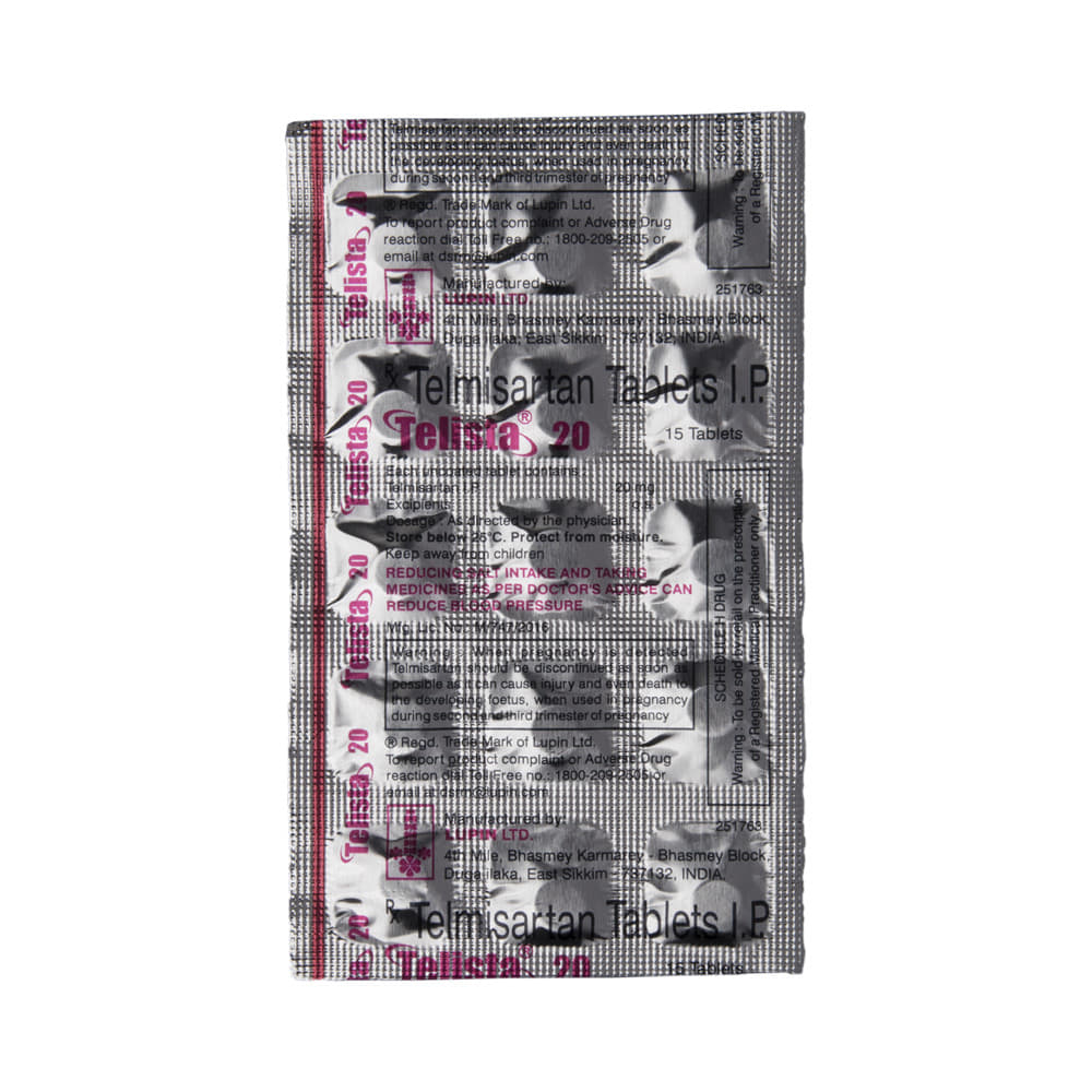 Telista 20 Tablet is a medicine used to treat high blood pressure and heart failure. Lowering blood pressure helps prevent future heart attacks and strokes. This medicine is also effective in preserving kidney function in patients with diabetes. Telista 20 Tablet can be prescribed either alone or in combination with other medicines. It can be taken with or without food, but take it at the same time every day to obtain effective results. It is important to continue taking it regularly even if you feel well or if your blood pressure is controlled. Most people with high blood pressure do not feel ill, but if you stop taking this medicine, your condition could get worse. This is a widely used medicine and is considered safe for long-term use.Making some changes in your lifestyle will also help lower your blood pressure. These may include regular exercise, losing weight, smoking cessation, reducing alcohol intake, and reducing the amount of salt in your diet as advised by your doctor.Common side effects of Telista 20 Tablet include diarrhea, back pain, sinus inflammation, and skin ulcers. Let your doctor know if any of these side effects bother you or worsen. They may be able to help by reducing the dosage or by prescribing you an alternate medicine.Before taking this medicine, let your doctor know if you have any kidney or liver problems. Pregnant or breastfeeding mothers should also consult their doctor before taking it. Your doctor may check your kidney function, blood pressure, and potassium levels in your blood at regular intervals while you are taking this medicine.