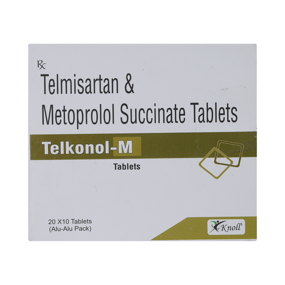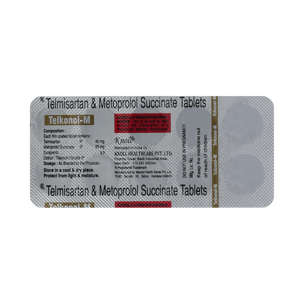 Telkonol M 40mg/25mg Tablet is a combination of two blood-pressure lowering medicines: Telmisartan and Metoprolol Succinate.