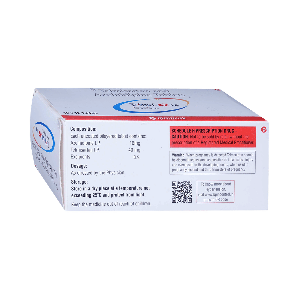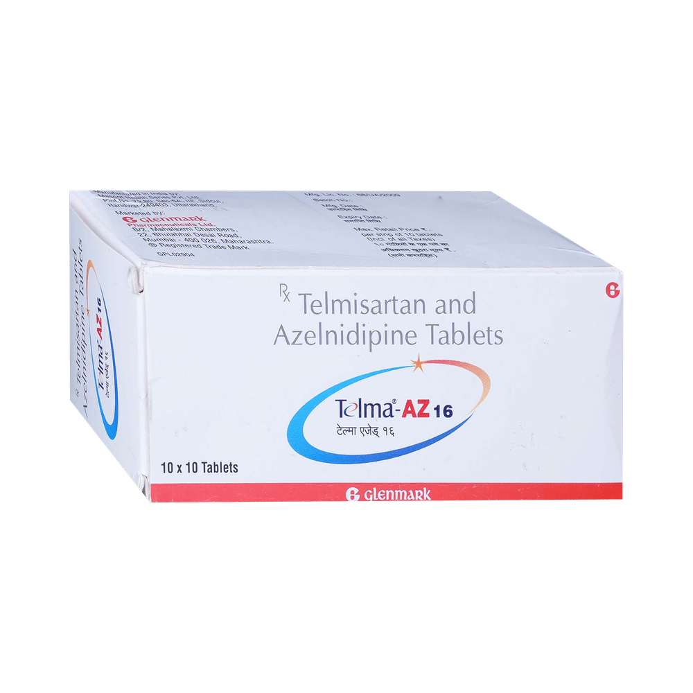 Telma-AZ 16 Tablet is a combination medicine used in the treatment of hypertension (high blood pressure). It widens and relaxes the blood vessels, thereby lowering your blood pressure and reducing the workload of your heart. Controlling your blood pressure prevents future complications. Telma-AZ 16 Tablet may be taken with or without food. Take it regularly and at a fixed time each day to get maximum benefits from it. In case you have missed any doses, take it as soon as you remember it. Never skip any doses and finish a full course of treatment even if you feel better. Do not stop taking suddenly without talking to the doctor as it may worsen your symptoms.The most common side effects of this medicine include dizziness, headache, nausea, and numbness. These are usually mild but let your doctor know if they bother you or last more than a few days. You may be asked for regular monitoring of blood pressure, kidney function, and blood glucose level while taking this medicine.Before taking this medicine, tell your doctor if you have liver or kidney disease. You must tell your doctor if you are pregnant, planning pregnancy, or breastfeeding. You should also let your healthcare team know all other medicines you are taking as they may affect, or be affected by this medicine.