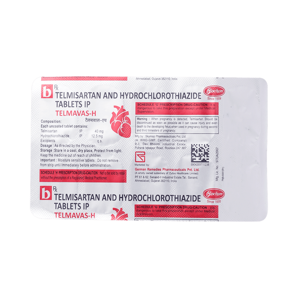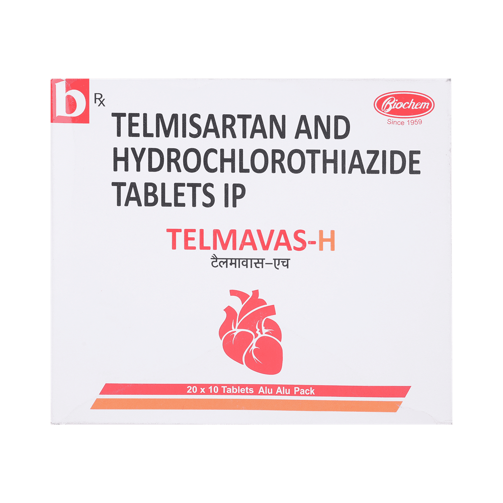 Telmavas-H Tablet contains two medicines, both of which help to control high blood pressure. It is generally used when one medicine alone is not controlling the blood pressure effectively. Lowering blood pressure helps to reduce your risk of having a heart attack or a stroke in the future. You can take Telmavas-H Tablet with or without food. The dose will depend on your condition and how you respond to the medicine. Try to take it at the same time each day. It’s important to keep taking this medicine until your doctor tells you not to. It contains a diuretic (water pill) and will make you urinate more, so it is best to avoid taking this medicine within four hours of going to bed. Use this medicine regularly even if you feel better to get the most from it. High blood pressure does not usually have symptoms and if you stop taking it your risk of heart attack or stroke may increase.The most common side effect is dizziness. Other side effects include feeling tired, nausea, shortness of breath, and changes to your heartbeat. Frequent urination is not a side effect of this medicine. It is the purpose of this medicine as frequent urination helps control your blood pressure. You may experience other possible side effects, but most are rare. Make sure you read the leaflet that comes with your medicines and tell your doctor if you are bothered by side effects or they do not go away. It may be possible to adjust your dose or try a different medicine.Do not use potassium supplements or salt substitutes unless your doctor has told you to. This medicine is not recommended during pregnancy or while breastfeeding. You should ask your doctor before taking it if you have kidney or liver disease, heart trouble or diabetes. Drinking alcohol can further lower your blood pressure and may cause side effects.