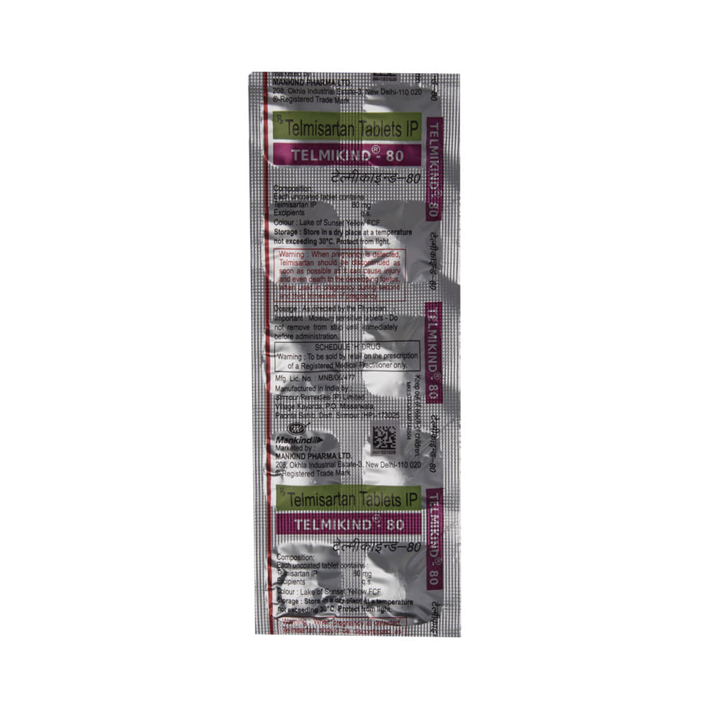 Telmikind 80 Tablet is a medicine used to treat high blood pressure and heart failure. Lowering blood pressure helps prevent future heart attacks and strokes. This medicine is also effective in preserving kidney function in patients with diabetes. Telmikind 80 Tablet can be prescribed either alone or in combination with other medicines. It can be taken with or without food, but take it at the same time every day to obtain effective results. It is important to continue taking it regularly even if you feel well or if your blood pressure is controlled. Most people with high blood pressure do not feel ill, but if you stop taking this medicine, your condition could get worse. This is a widely used medicine and is considered safe for long-term use.Making some changes in your lifestyle will also help lower your blood pressure. These may include regular exercise, losing weight, smoking cessation, reducing alcohol intake, and reducing the amount of salt in your diet as advised by your doctor.Common side effects of Telmikind 80 Tablet include diarrhea, back pain, sinus inflammation, and skin ulcers. Let your doctor know if any of these side effects bother you or worsen. They may be able to help by reducing the dosage or by prescribing you an alternate medicine.Before taking this medicine, let your doctor know if you have any kidney or liver problems. Pregnant or breastfeeding mothers should also consult their doctor before taking it. Your doctor may check your kidney function, blood pressure, and potassium levels in your blood at regular intervals while you are taking this medicine.