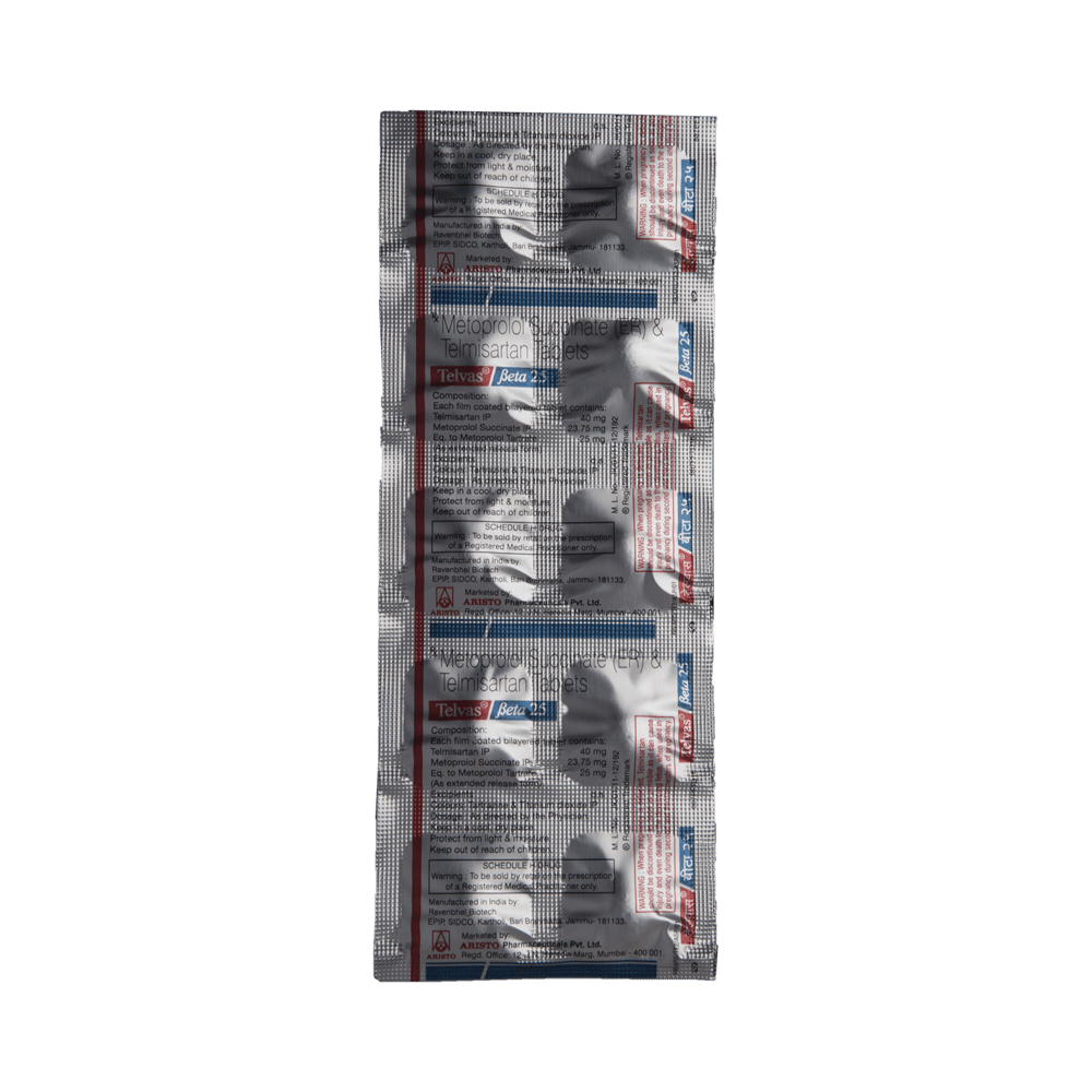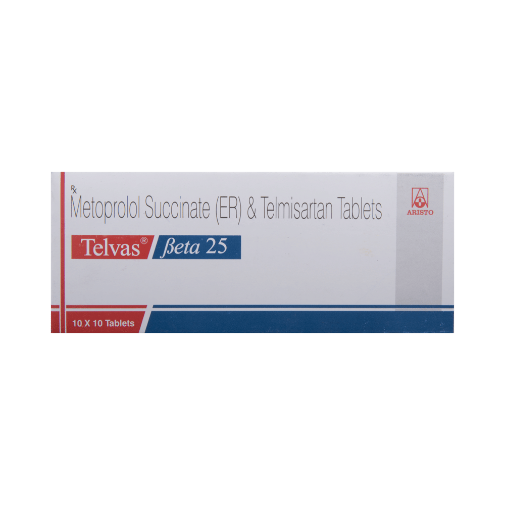 Telvas Beta 25 Tablet ER is a combination of two blood-pressure lowering medicines: Telmisartan and Metoprolol Succinate.