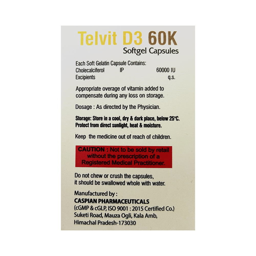 Telvit D3 60K Softgel Capsule is a form of vitamin D. It raises vitamin D levels in your blood. This, in turn, increases calcium levels in your blood by helping you absorb more calcium from food.
